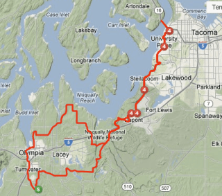 This was the second time riding to the narrows. The first time I didn’t know there was a back way from Mounts Road and jean and I took a short jaunt on the freeway shoulder. Fellow teammate Dave Chipchase had told me about a cut in the fence from Mounts Road to the housing tract in Dupont. It was an easy find. It took a bit to negotiate my way to the hwy leading from Dupont to Stielacoom, but I eventually found it. And on the way back I discovered the most direct route. It begins with a right turn at the traffic light just as one heads back from Stielacoom on the hwy. Take this road, which the name I forget until Hooper Road. Take a right and proceed to Hoffman Hill and take another right. This leads over and down, back to the fence cut.