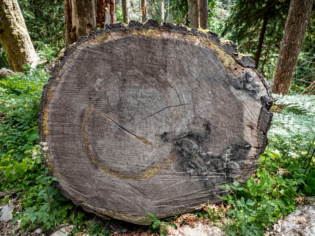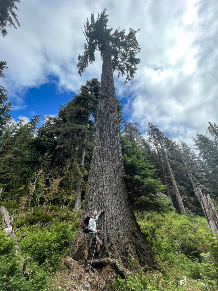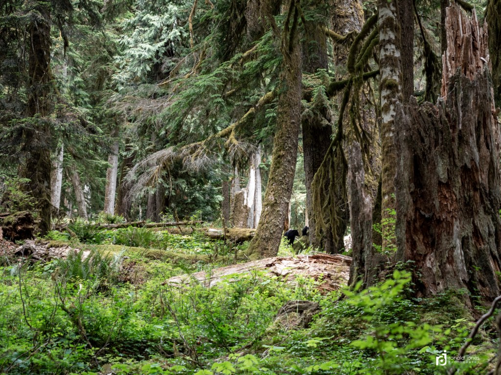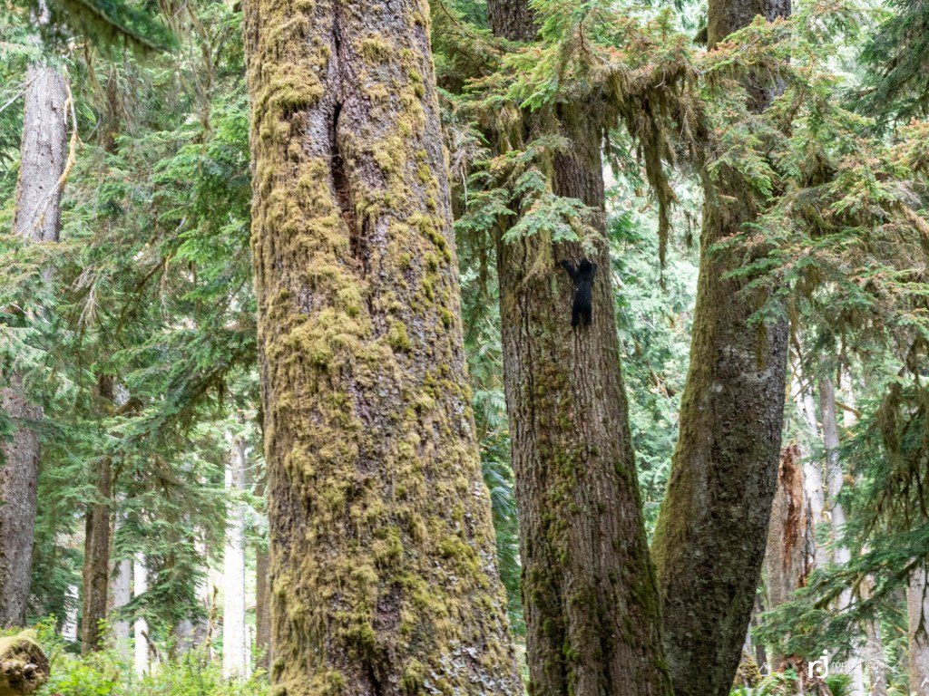 As the trail rose and bent left Jean shouts “BEAR”, of course I don’t see a thing and it takes a moment to get my bearings, scanning the forest and trail in front of me. Then I see it, it’s a cub, a little cub, this year’s cub (such a cute little thing!), and it’s running away from us with that telltale human baby cry and immediately scales a fairly large diameter hemlock like Alex Honnold running up an easy rock face, all the while bits of moss debris are being ripped from the tree. It’s at this point, all happening concurrently in a fraction of time, “where’s momma, where’s momma?” Baby bear is calling out, and then we see momma bear in the distance. I’d guess 150-200′ away. In hindsight, after returning on Sunday, it was more obvious the bear cub was almost on our trail when we spooked him/her. So maybe the tree was 50′ away. It’s really difficult to judge these distances. So now momma is walking slowly forward to us. Jean and Andy begin to retreat and I remind them to not run. They hadn’t run, but just a reminder. I start shouting “hey bear, hey bear”. We retreat a bit but then walk back up. At this point momma has a bead on us and a step forward by us, results in momma bear taking a step forward toward us too. She is looking at us. She is in charge, but does not charge, thankfully. Very uncomfortable to say the least. Jean has been wanting to see a bear in the wild. Careful what you wish for – right? I’ve had many encounters coastal kayaking and just one other hiking in the Tetons. All were benign. This time the situation was far different. Whether 100, 200 or 300′, she could cover that distance quicker than we could react. I am not in the habit of carrying bear spray except grizzly country. Andy had bear spray and was ready. We ended up backing up a bit, but also trying to not lose sight of her. Contemplating if we should bushwack well below the trail. But we decided to hang out and wait. We finally saw her get to the tree, along with her other cub (yes 2!), and finally the cub in tree made a semi-controlled descent back to momma. At this point they went uphill into the trees. We carried on hiking and caught glimpses a few times until they were gone and we were headed downhill. We take a break by Pyrites Creek, and bask in the afterglow of the adrenaline-induced high – Recounting our narrow escape 🙂 Just glad the cub was not on the other side of the trail, putting us in the middle of him/her and momma.