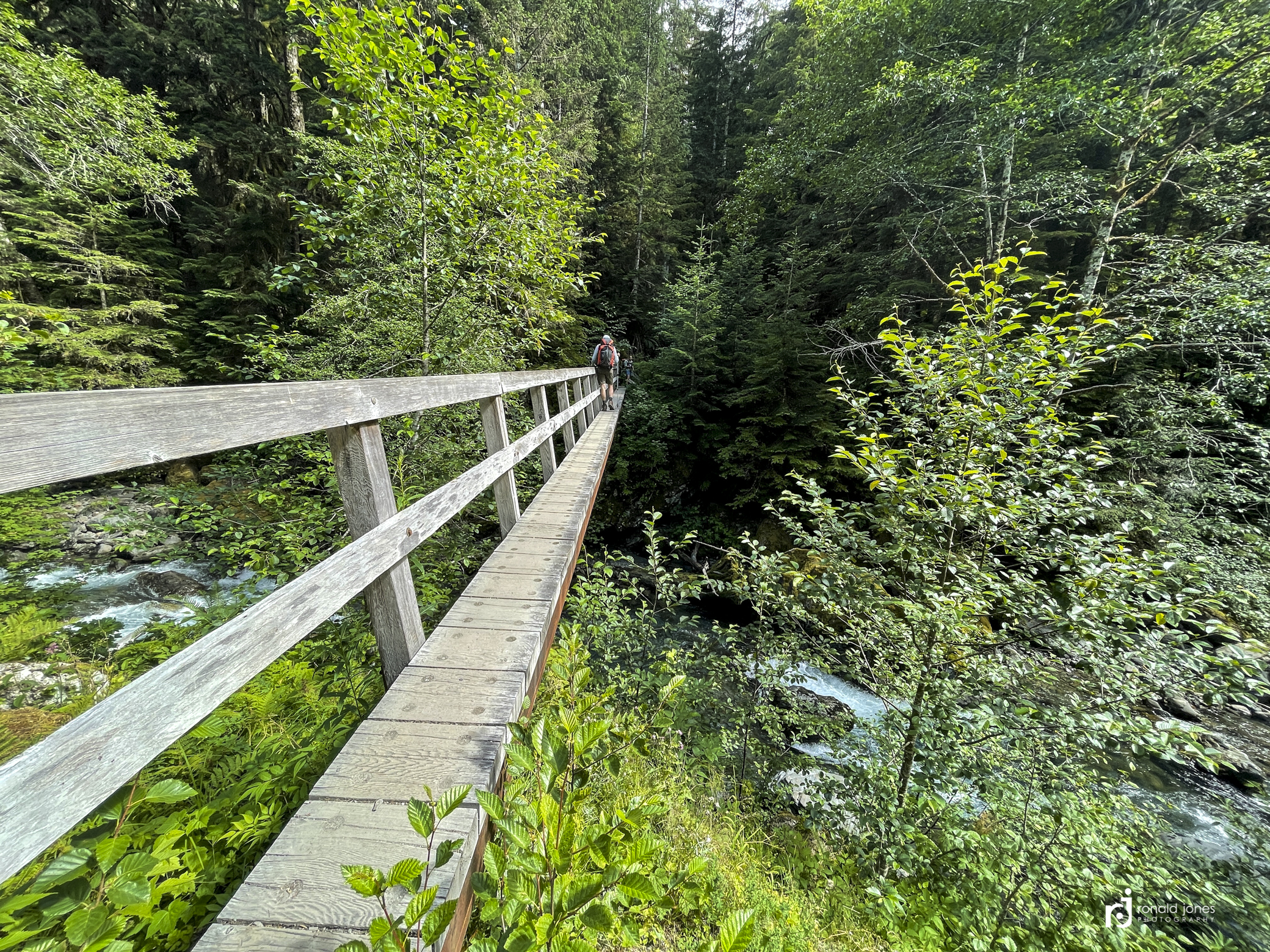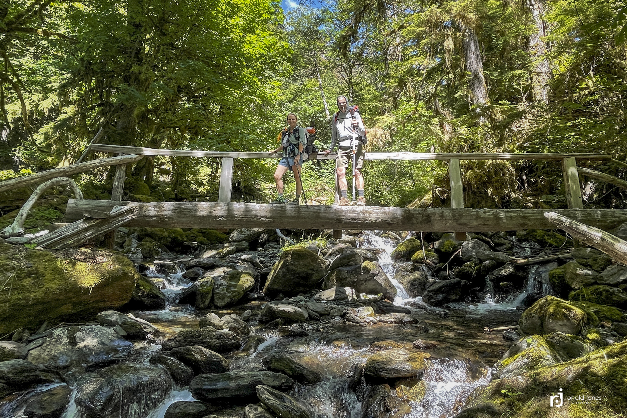 These last images. Most speak for themselves but there is a funny story behind the bottom image of Andy and Jean on the log crossing. As we approached I said for them to go ahead. I began walking the rocks over the stream so I could get a photo. Using my iPhone 12ProMax. Not an inexpensive tool/toy. I was just about to where I wanted to be, when a foot began to slip on the ‘slippery’ rocks, which resulted in a sort of dance to stay upright, not dunk my phone, nor fall over backwards (I had my pack on). I ended up sitting/falling backwards to my bottom, phone held high, but wet, feet wet, but I “GOT THE SHOT!