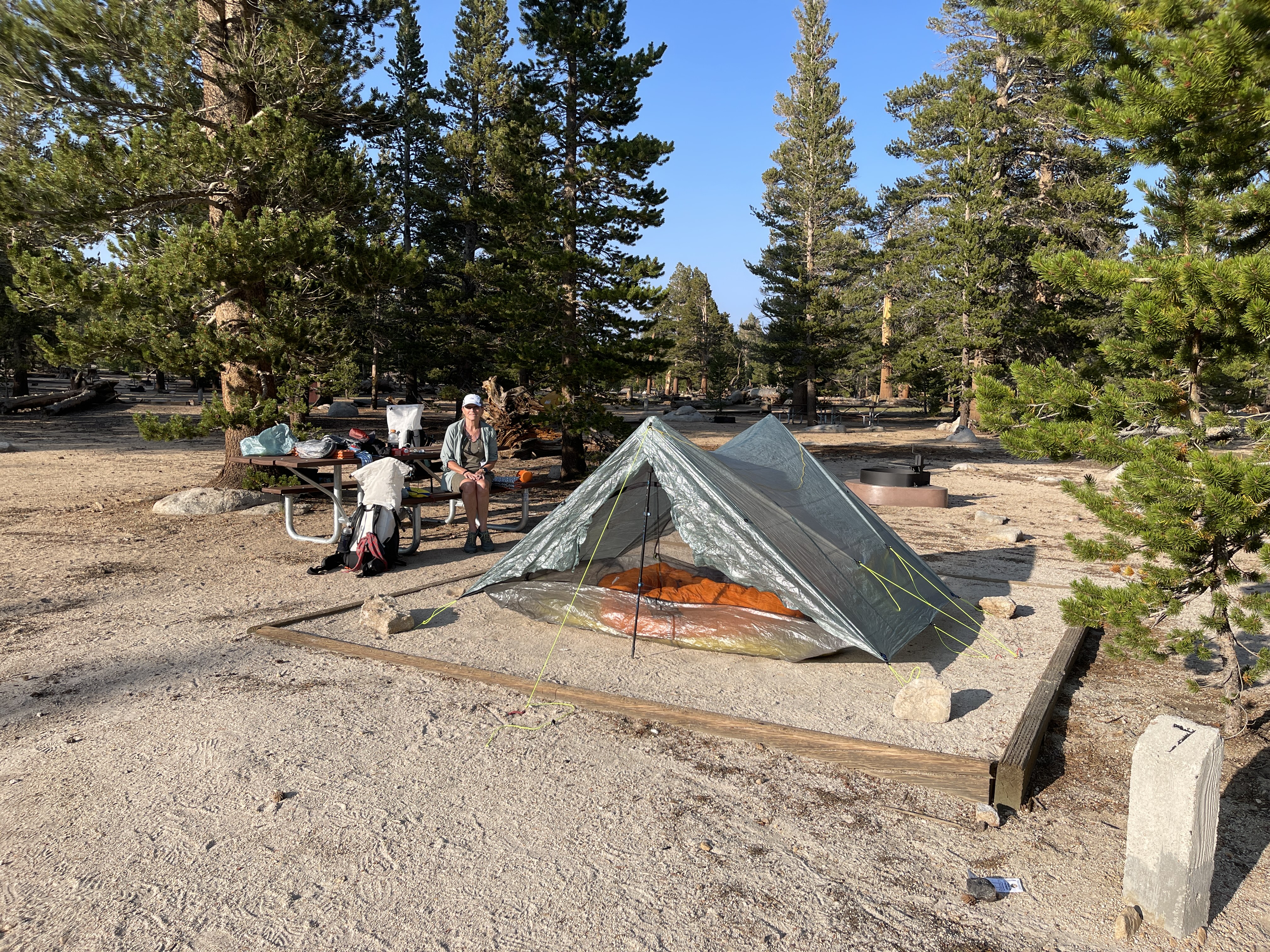 Monday morning came quick. 38 degrees. Not bad! We started right away getting into the routine which we’d hold pretty well for the entire trip, which was starting to pack up from the inside/out between 5:00 and 5:30AM (using headlamps!) This got us on trail between 6:15 and 7:00AM. We slept with all gear in the tent, except the food and anything with odors (toothpaste, etc.), which lived in the bear canisters outside and away from the tent. For this trip, I had purchased us a Zpacks Triplex – a roomier version of the duplex. It fits three, but works best, in my opinion, as a roomy two-person. Whereas the duplex is snug for two and very roomy and perfect for one. the triplex weighs 24 ounces, plus I another 5 ounces of stakes. So 29 ounces in all not counting trekking poles, and doesn’t need a footprint. And it worked well for the 6 days I was solo at the end too. It (triplex) is a virtual palace!