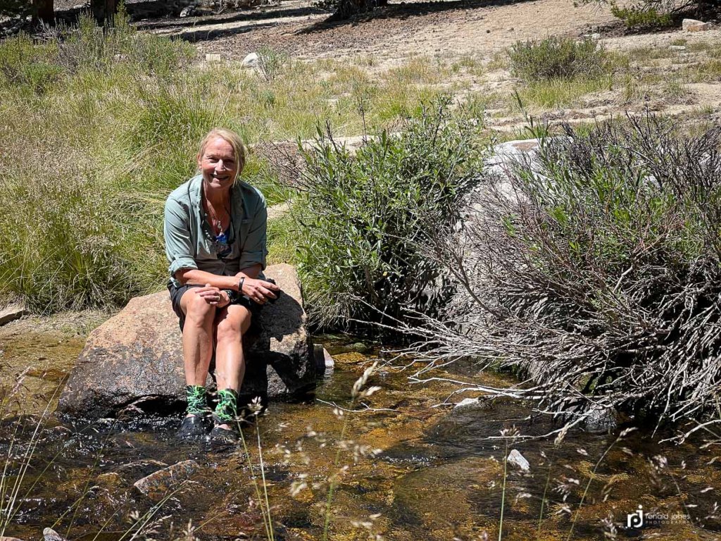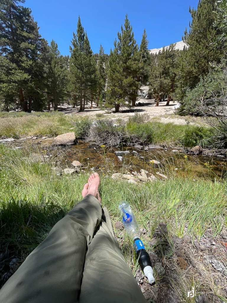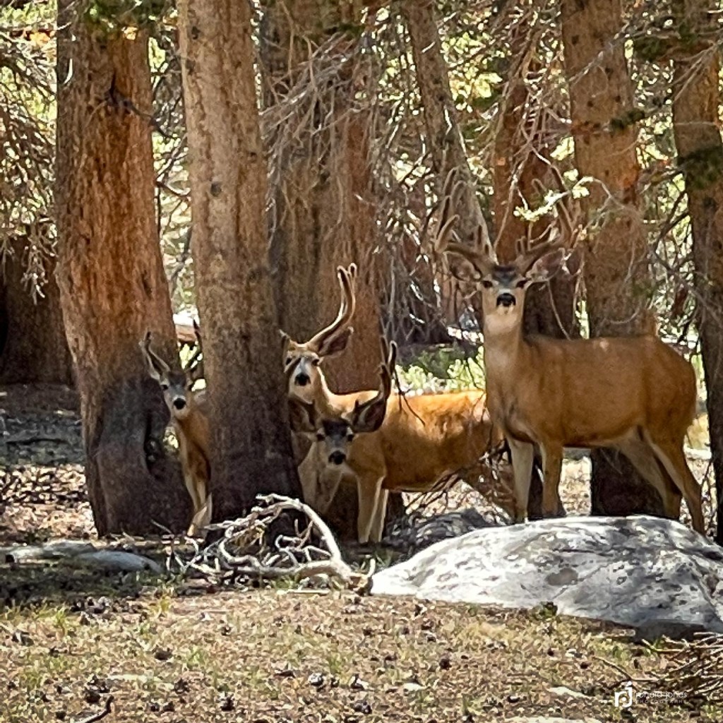 We chatted with some folks at Crabtree and then we walked up the trail. I acted like I knew what I was doing. Thinking I was headed to Guitar Lake. Whoops, the ranger station. Hmmm. Well, I wanted to see it anyway. There was a use-trail to the left so I took us down that and then some off-trail to the river and back in sight of the main trail. We were away from people We soaked our feet and had a nice break. Prior to making the river, Jean spotted some deer. Four deer in fact. And all bucks. This is known as a ‘stag party’. She was definitely the wildlife spotter on this trip. I usually had my head down cranking out steps, fidgeting with my phone taking photos or checking guthook and gaia.