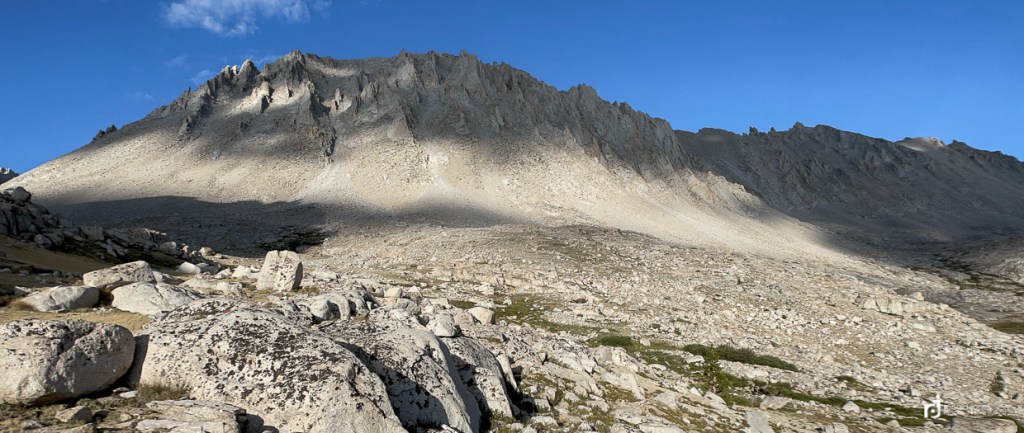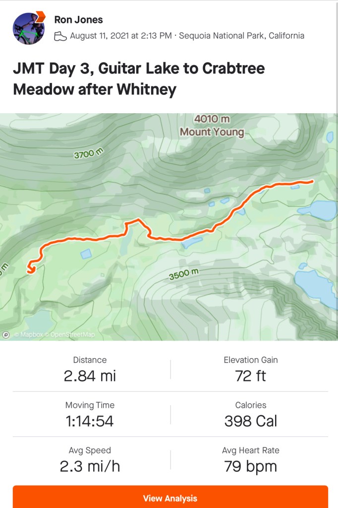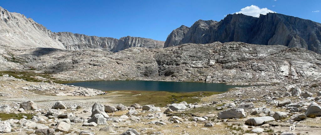 We were at it shortly after 5AM, but did take a bit to motivate. I originally thought we might just pack up and be walking at first sign of light, and have coffee and breakfast after an hour or two. We did that just once together and I did it once solo. It was just easier to take care of business first thing. We found a good routine. Day 2 was a bit shorter. A little over 10 miles in 8 hours. It feels hot. We don’t need to carry but 1.5 liters, and could get by with less. We climbed over Guyout Pass through more sparse and large trees and granite rock. Mostly talus and sand, some slabs. We met up with some folks at Crabtree Meadow, which is about 3 miles from Guitar Lake. It’s doable to hike Whitney from Crabree, but adds 6 more miles. But technically only three if you do what we did, which is camp at guitar the night before and then break camp on the way down and travel back to Crabtree.