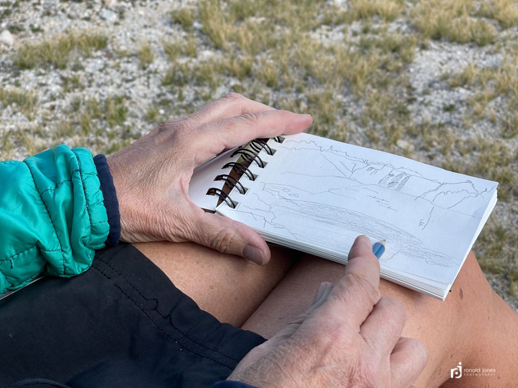 Jean brought a small sketch book, but really didn’t have a lot of time, nor energy to sketch once we got to camp. Guitar Lake was one of the few times she was able to sketch. She like her new under garments which came by way of friend, Sarah who recommended them.