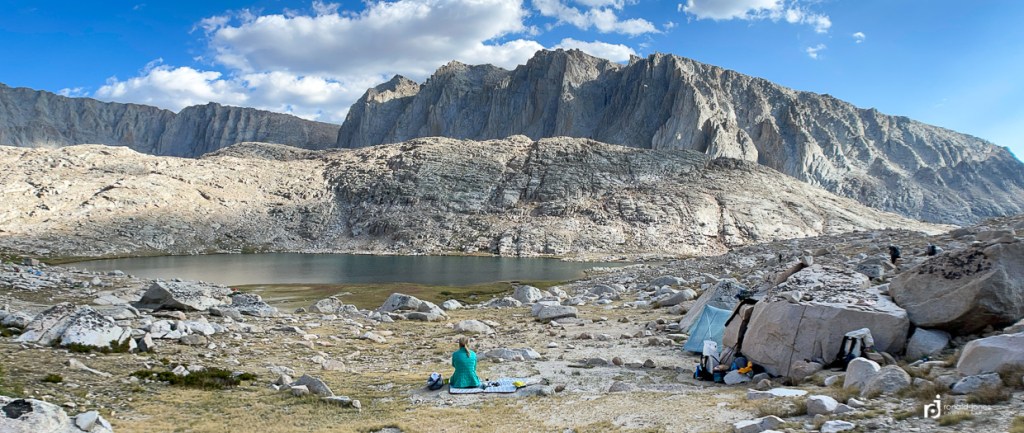 The climb to Guitar Lake was a doozy. It was getting warm and we were tired. We decided to make camp up higher, before the lake to avoid being on top of everyone else. We had a nice inlet stream and watch folks walk past our camp. Right after we got the tent set up, I noticed a much better spot closer to the trail. It was actually hidden from the trail and everyone walked right past it. We were in camp by 3PM. Some clouds rolled in and the wind cooled things down. When the wind stopped, it was downright hot. When it blew, it begged for puffy coat.
