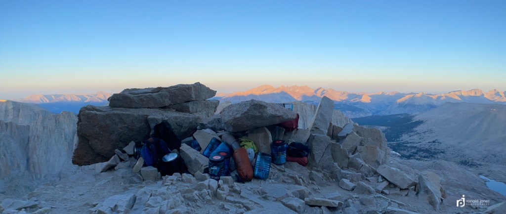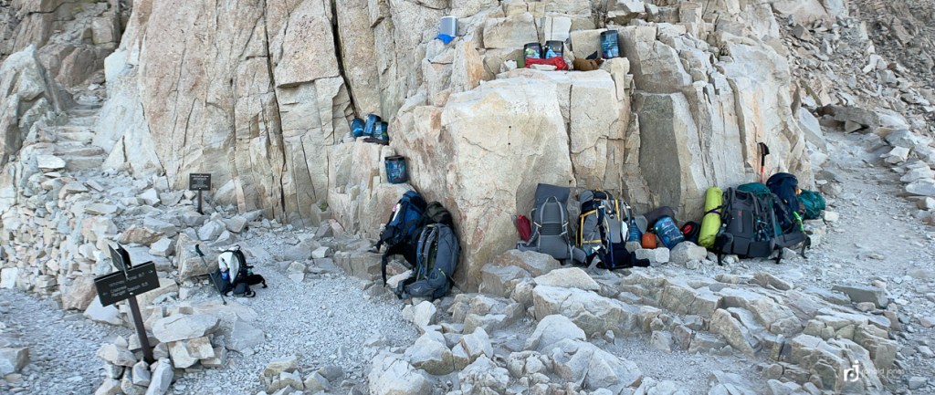 After a couple hours, we had enough light to turn off our head lamps. It was cool, but not cold. Perfect hiking weather. We made trail crest, the area in photos below with all the backpacks and bear canisters. This spot is 1.9 miles from the summit, and somewhere around 13,000′. It’s where southbound hikers exiting Whitney Portal, or northbounder’s coming from Whitney Portal leave their full gear packs for the summit push.