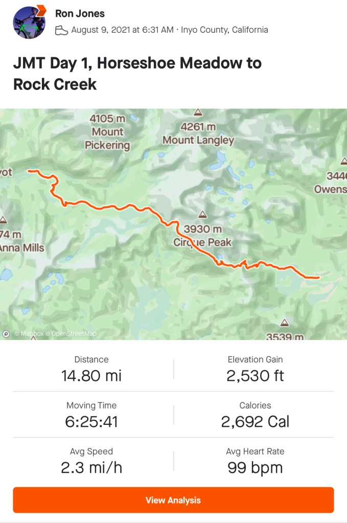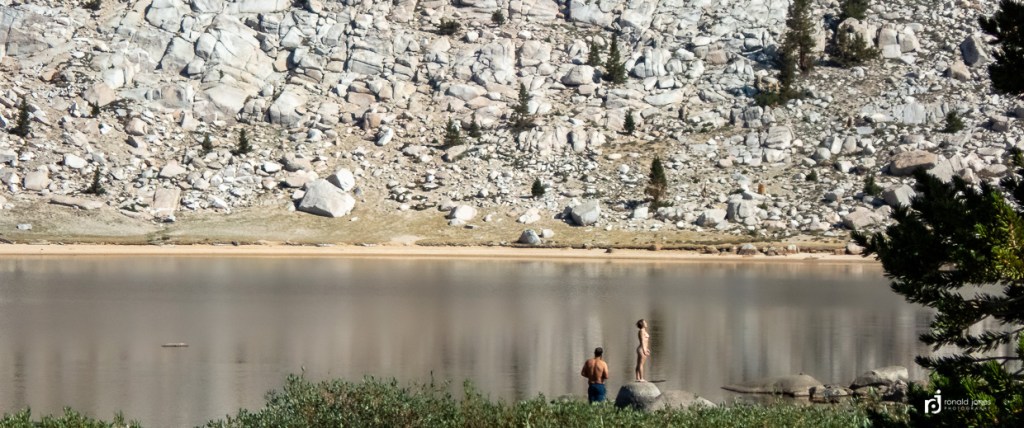 Day one seemed straight forward enough. Hike 14 miles, set up camp. We would reach water in 4-5 miles at Chicken Spring Lake after going over Cottonwood Pass at 11,200′. Easy peasy. The morning was cool and hiking pretty easy compared to what we would be seeing later that day and throughout the hike. Ascending the pass we met two young ladies who were bailing on the JMT due to altitude issues. They did a loop hike over three days. Hmmm. It gives me pause but we carry on. At Chicken Spring we come across a couple doing a nude photo shoot. We give them space. Fill up our bottles and bags. I carry 3.75 liters, Jean, 1.75 liters. We have a 9 mile dry stretch and it’s getting warm. We would use nearly all our water by the time we make camp. The hiking was somewhat exposed to the full sun. Occasionally in sparse trees. We had a pretty big flattish area then a very long descent to 9,600′ at Rock Creek. By the time we pulled into camp, Jean was on fumes. Basically out of gas, overheating, and misfiring. I was only slightly better. We found a good spot right next to the trail and close to the creek. Some guys came by and caught some golden trout.