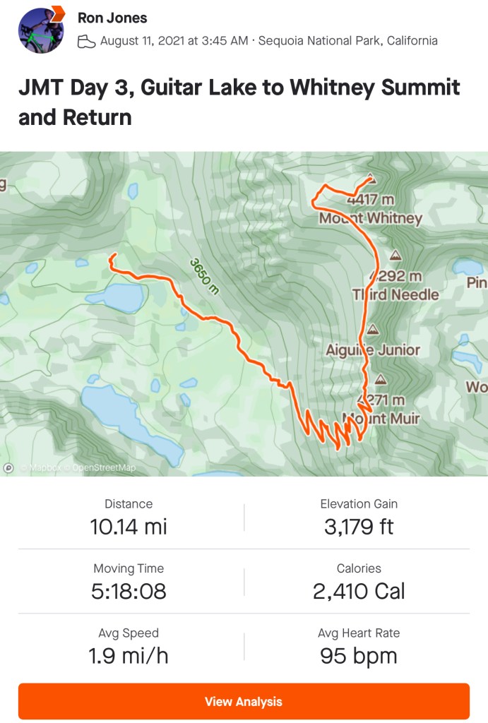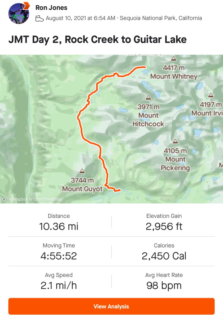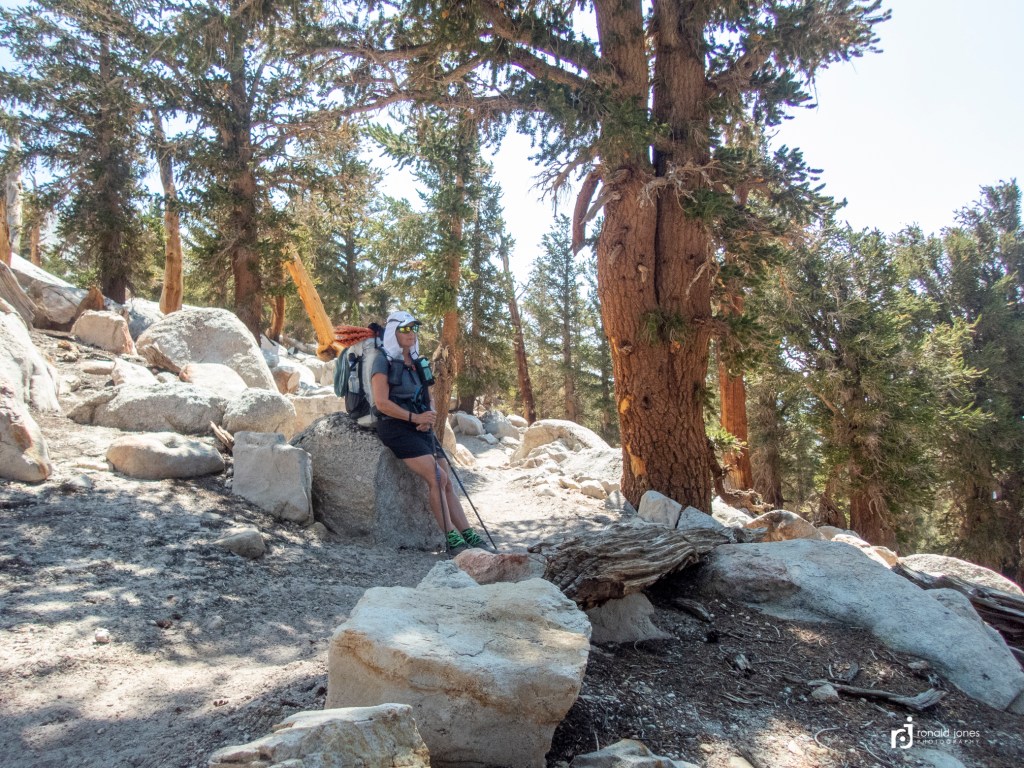 At the end of the day, we didn’t have serious impacts related to altitude. We both slept poorly the 2nd night at guitar lake at 11,600′, prior to Whitney Summit day. No real headaches, no nausea, and no loss of appetite. That written, Jean did have a headache of sorts that may have been more muscular tension from the backpack than a headache from dehydration or altitude. It appeared that second night and was around on night four at Forester Pass approach at 12,000′. Not noticeable in the day. Only laying down. But was in the area where the spine runs up the neck to the base of the skull. On the fifth day, Jean tripped and fell hard. Luckily not hurt bad. Ironically, she never complained of neck pain again.