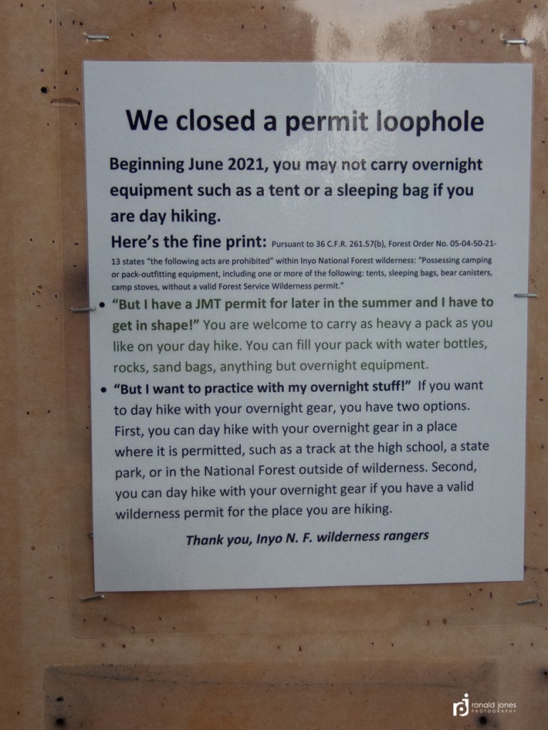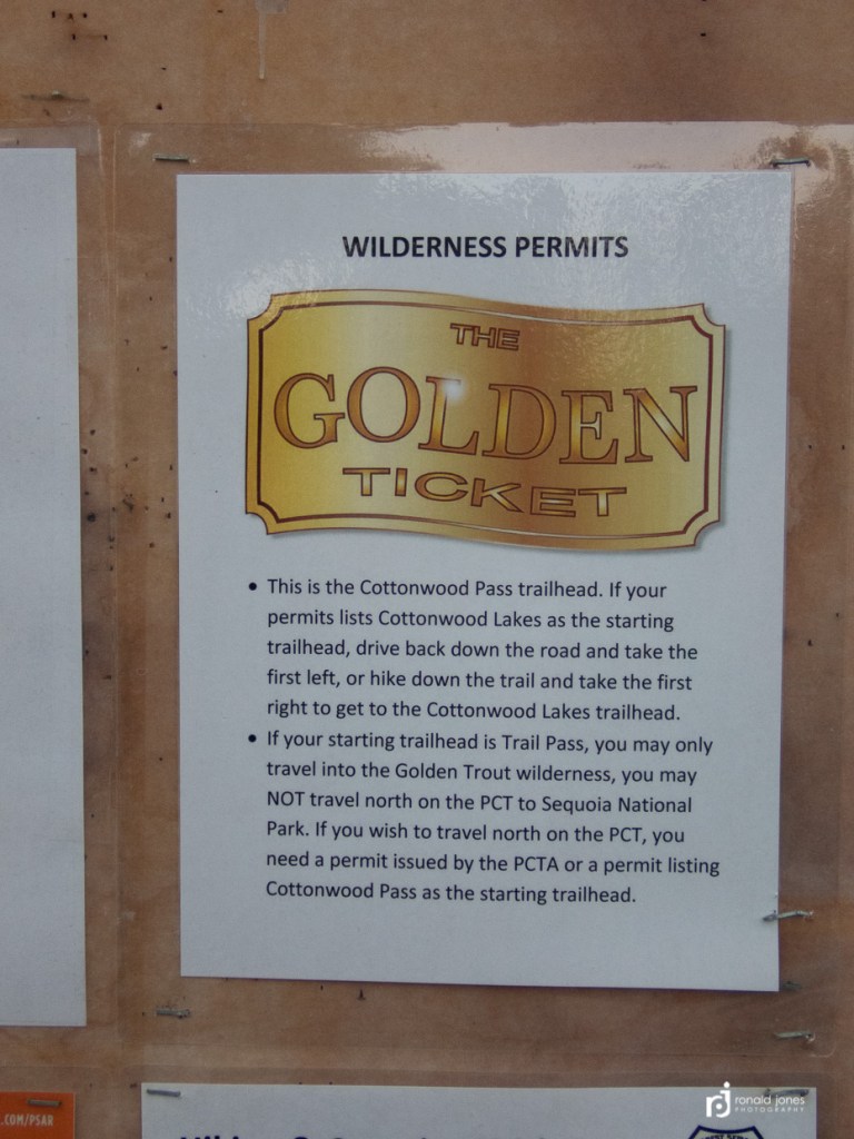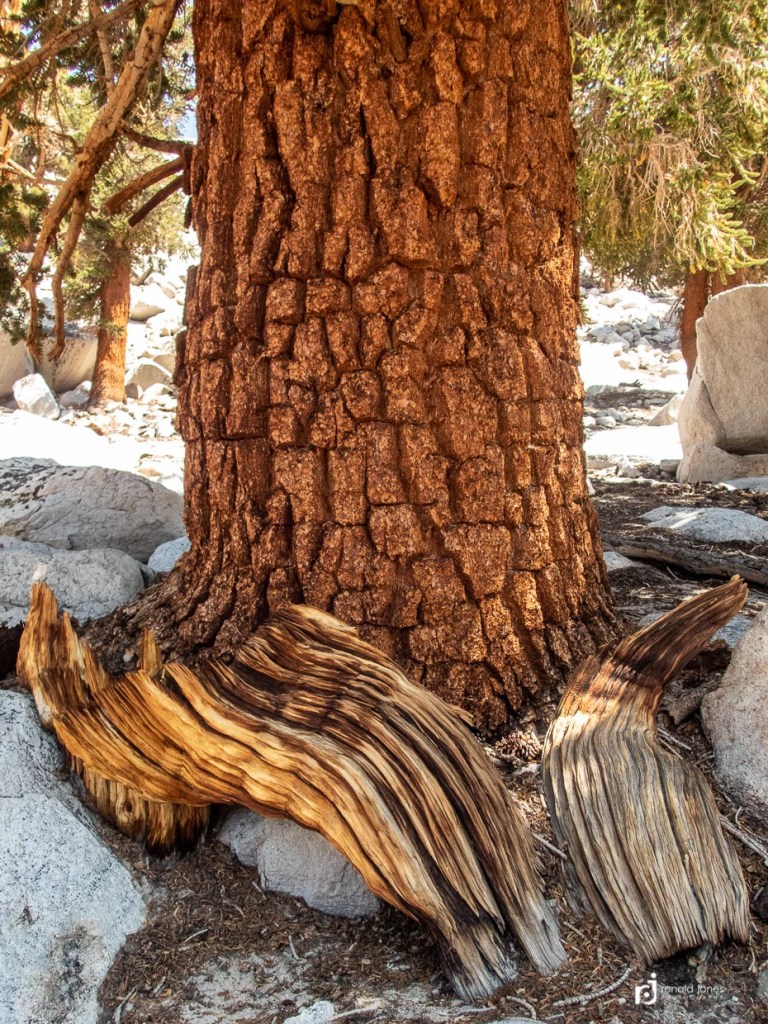 Nude photo shoot couple walked by and found a spot a couple hundred yards away on the other side of the trail. Later that evening, they bounced nude from camp to creek and back. They were extremely nice, and later when we met them again on Whitney (we were coming down, they were going up) we had a great chat and wow – they had energy! This day would ultimately prove to be rather typical in terms of time spent in transit from camp to camp. It was around 5PM when we stopped. Our moving time and actual elapsed time were quite different most days. It’s amazing how much time is spent stopped, whether taking a real break, talking to someone, or taking photos. And that ‘golden ticket’ photo is a bit of a misnomer. The so called, ‘golden ticket’ is not from Horseshoe Meadow, but if one is lucky enough to get a Yosemite or Whitney Portal entry. Most consider the Yosemite entry to be the ‘golden ticket’. Our only requirement for our permit was to start at the trailhead listed, on the day listed, and take the first day’s trail – if more than one option, which there was. That written, we had to fill out a complete 21-day itinerary just to show we were serious I guess. I wish I had downloaded a tree identification booklet or app. Someone told us the bark that looked like a jigsaw puzzle was a Jeffery Pine (bottom left) but I question that.