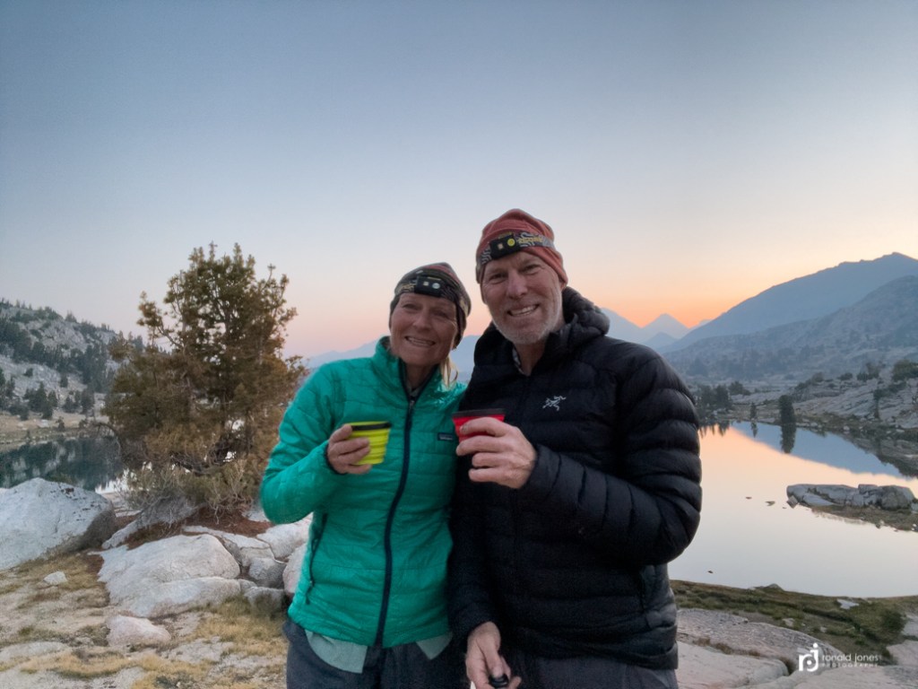 The photos below are actually from Sunday morning. Phil, Tish and Josh showed up Saturday mid-day. We had last seen them just before Charlotte Lake where our paths split. They needed to exit over Kearsage Pass to Onion Valley and the town of Independence for resupply, while we stayed on trail with a mule resupply. They would have a long Β½ day to exit, do their running around, stay the night in a hotel and then return to the trailhead and begin hiking. Kearsage is a serious trek just like all the passes. I was amazed to see them considering they had to hike at least 20 miles round trip to get back to where we left them. It was great to see them again and hang out. Phil and Tish’s daughter is dating a guy who is trying to grow a small clothing line – Jolly Gear (https://jollygearapparel.com) The signature piece is the button-down trekking shirt with sun hood that Phil and Tish are wearing in the photo below. A cross between the Columbia Omni-shade (Link to Amazon Columbia Products) like I’m wearing in the photo, and an Outdoor Research Sunhoody.
