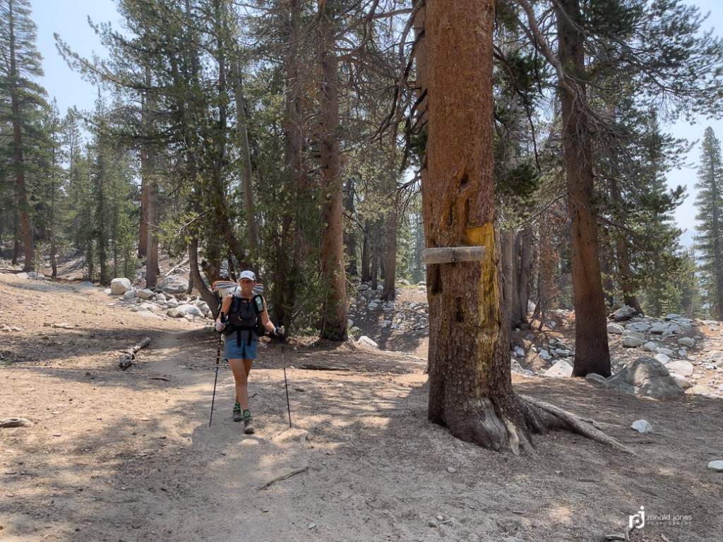 I don’t know what I expected, but a mule trail was not part of my thoughts. This trail appeared to get a lot of mule traffic and it was also a lot of soft sandy granitic sand (that’s what I’m calling it). Sand with boulders. In many of the steeper sections we had to go off trail to avoid losing footing, twisting an ankle or worse. When we met up with Phil, Tish, and Josh the next day, Tish mentioned how they really liked this section, in part because of a flat middle portion. We didn’t have the same sentiments. We really didn’t like any of it. I think largely because it was later in the day, and it was hot. No breeze, hot, and getting more smokey as we descended. In hindsight, the middle flat section was pretty. And it was not dry as everyone had been saying, and of course gut hook showed no water. There was a pretty sizable creek about Β½ down.