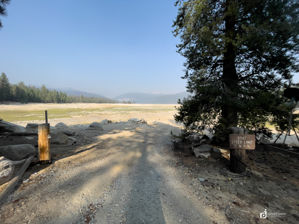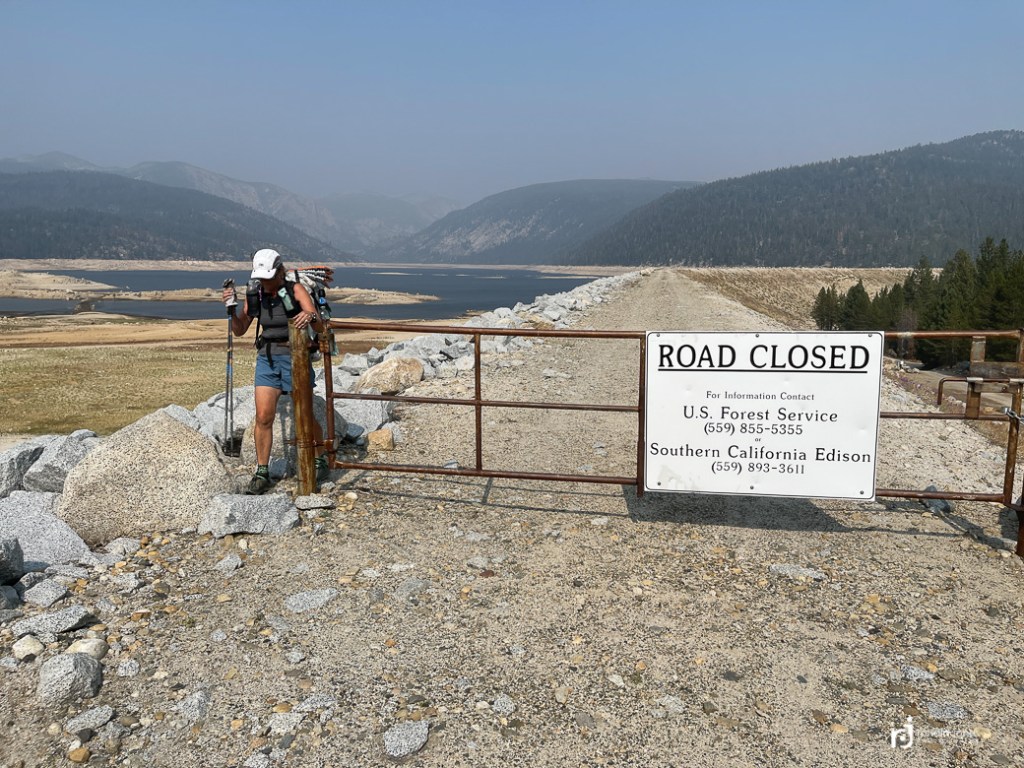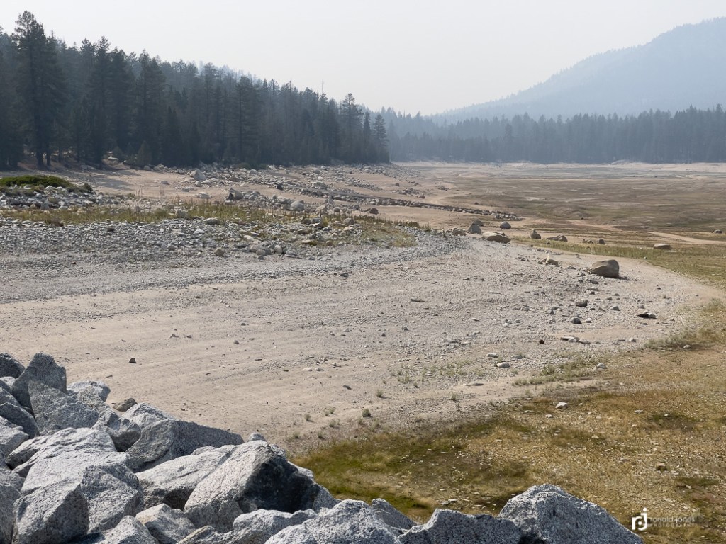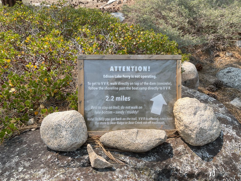 Indeed, the water level was low. We later learned that Lake Edison was at 7 percent capacity. At 5 percent, no water can be drawn, legally. The lake is a hydro reservoir which is metered into another lake further down that in turn provides hydro-electric to Los Angeles, and aldo provides recreational opportunities. Then the water flows into a third lake that is a popular recreation area. I missed getting the photo at the start of the damn, but the previous sign said to walk across the damn, but at the fence and locked gate, there was no sign. It was a bit confusing. Clearly, we jumped the short gate/fence.