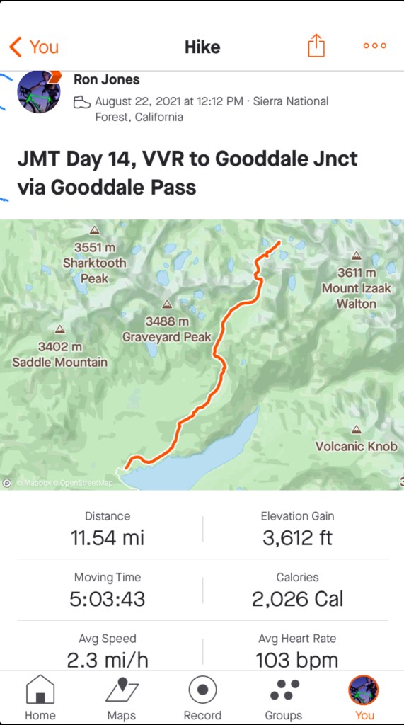 I found this link to a description of the hike from VVR up to and over Goodale Pass to the junction. It was about 10 miles to the pass, at just shy of 11,000′. VVR is around 7,700′.