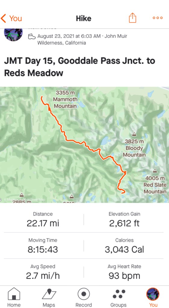 After Lake Virginia, the trail undulated above a canyon, more or less traversing a serious of ridges and ravines until finally hitting a longish downhill false flat to a very old burn area and Reds Meadow. At one point, I caught and passed a couple hikers. Prior to that, I had come across a small group stopped at the junction to Duck Lake. I looked at the sign, saw “Duck Lake this way”, and proceeded. About 50 yards later, I got to thinking, this doesn’t seem right. A quick check on Guthook and Gaia, yep, wrong way, I was supposed to turn left back there, so back I go. I made the comment, whoops!, as I passed the group again. They chuckled.