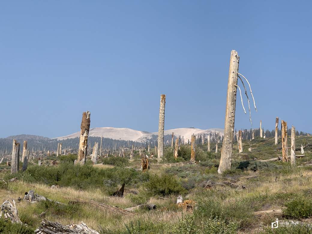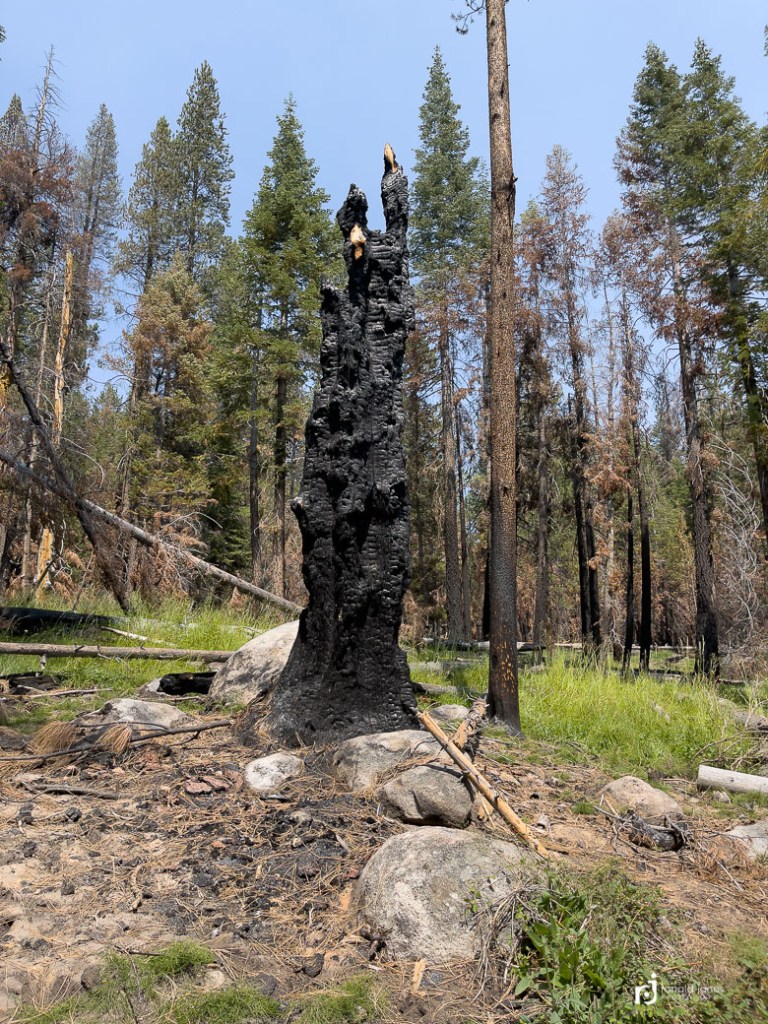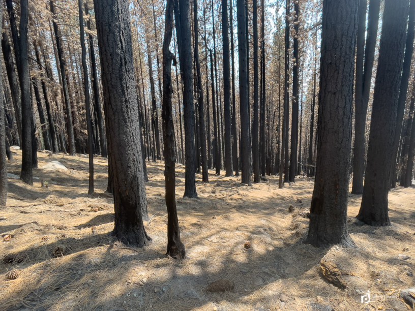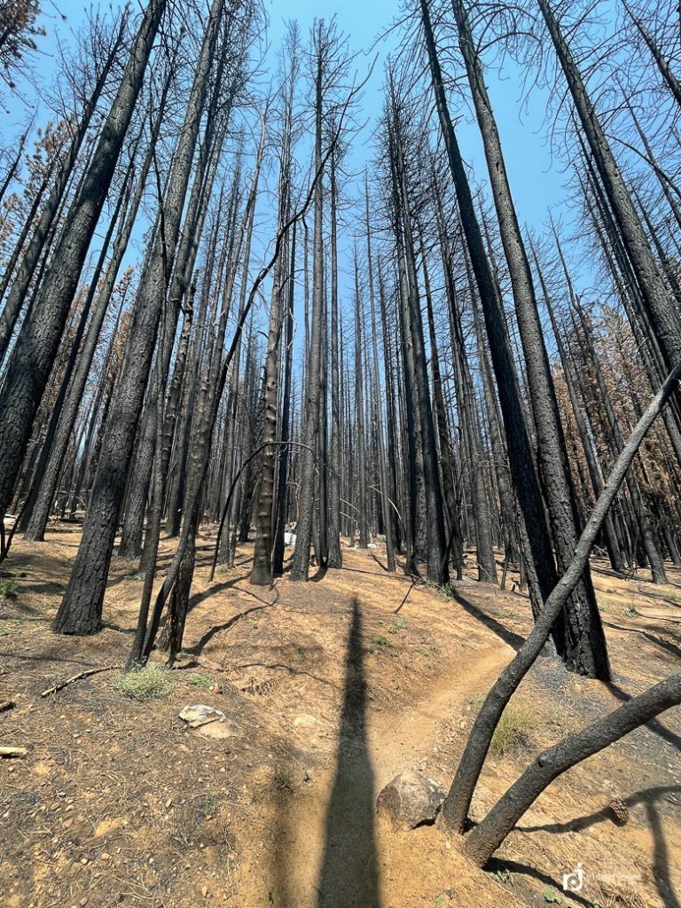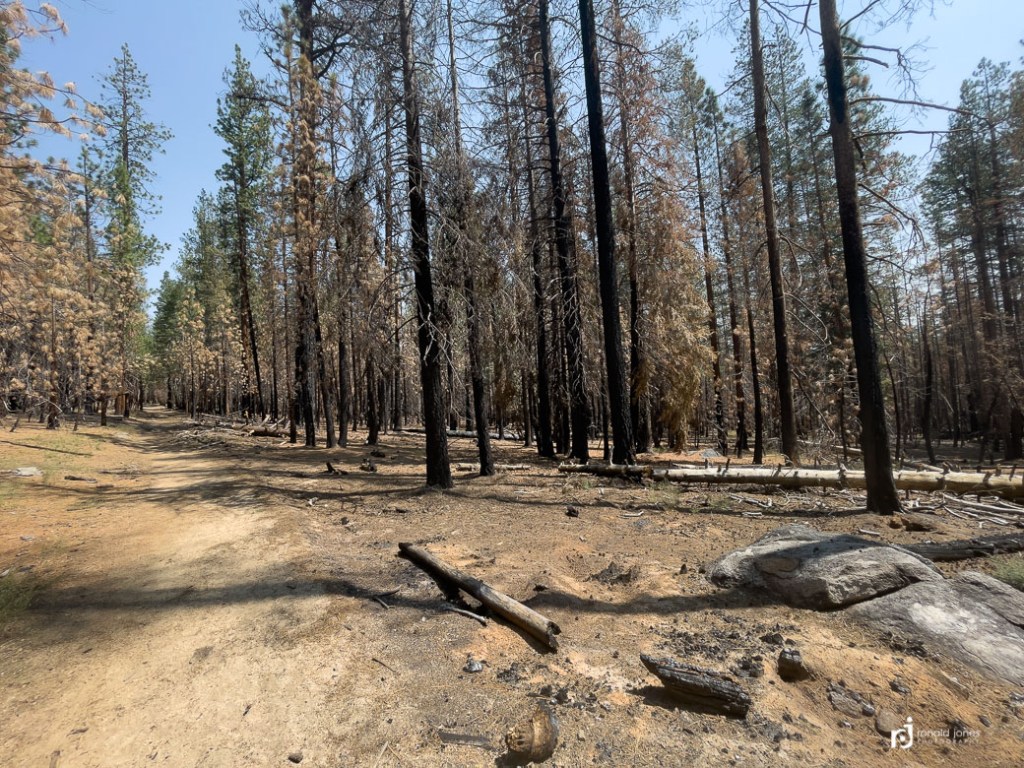 Walking the burn zone was both interesting and a little unpleasant. It was now midday and quite warm. There was a smoke haze, not bad, but definitely present. And the air smelled of charred wood and smokey embers. Almost heavy to the lungs. Most trees remained standing, blackened by fire. The earth scorched, where once the forest floor was a nice layer of duff and undergrowth. Now it was a mix of sand and fire ash, the color reminiscent of that grayish, colorless look when some one is very sick. I walk in on, the grade gently uphill, and with every step there is a little puff of fine dust.
