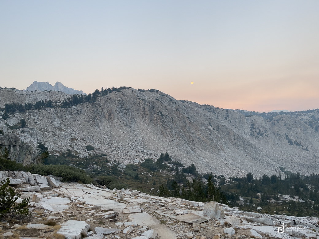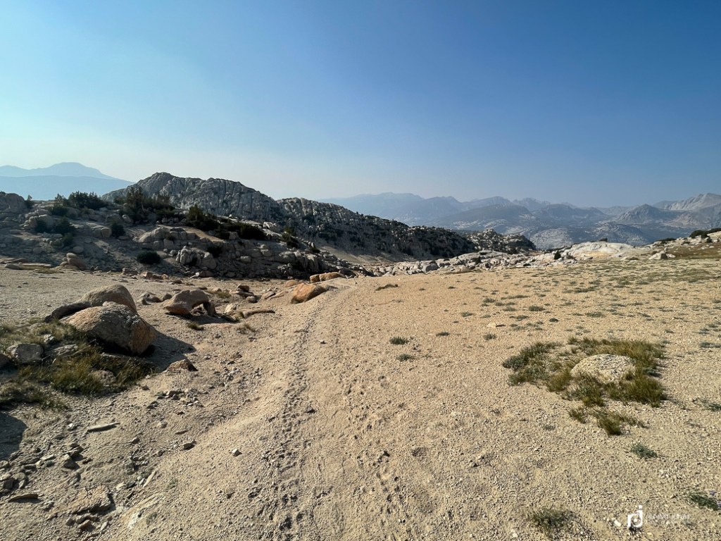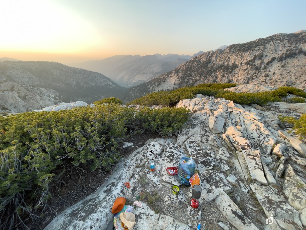 The hike to the summit was pretty straight forward. I passed a few people heading up. And met some coming down. At some point I had been asked again how far I was going. I had mentioned probably to the lake just this side of the pass. The person said there were no lakes on this side, they were on the other side. OK, thanks, again, not believing him. As it turns out, I had been looking at guthook on my phone and keyed in on Goodale Pass Junction. All the while, thinking it was the pass. When in fact, the pass itself was not marked. I had paper maps, but rarely looked at them. Had I been paying attention to contour lines and actually reading things, I would have noticed. I finally hit the last steep part and not long after, I was on the pass. But the pass itself was not marked. No summit sign. Then over and down I went. I then saw the lakes. There was smokey haze in the distance. I got water at one of the lakes and made the decision to camp high near the junction. The terrain was looking promising for camp. I grabbed 3-½ liters and packed it about ½ mile up, only to find a small pond. Ugh! Oh well. I went off trail a bit and found a nice secluded and protected spot above treeline. I set up camp and found a high spot for making dinner. It was after 7:00PM by the time I was making dinner. I finished up just before dark and got to the tent, and it was lights out.