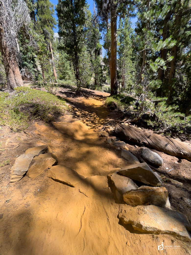 The day started easy enough which was great because I was a little tired. I figured I’d walk consistently but not fast and make Thousand Island Lake no problem. The terrain, with quite a few ups and downs had a different plan. I started the day in true John Muir fashion – sauntering, and soon found that my saunter was about all the speed I could muster. It went from cool, to warm to rather windy. On the passes it was quite windy, then more sheltered in the valleys. I’d travel past Gladys, Rosalie, Shadow, and Garnet Lakes before getting to Thousand Island. Each time it was a climb up, then down. As usual, most of the people I saw were headed SOBO. I also started to run into more hikers doing small sections of the JMT and other side trails. The lakes were really beautiful, but mostly down low in a recess. I came across a couple groups of trail volunteers, one was the CCC, or civilian conservation corps, and not sure about the other. They may have been more closely tied to the forest service. The first group was rebuilding the retaining wall and approach to a bridge, and I’m not sure what the second group was doing. I do recall wondering what this thunking sound was, and came around corner to find two guys sitting in the shade, full clothing, hard hats, face masks, and goggles, with a big pile of rocks and small sledge hammers/rock picks. They were busting rocks. The third person, was digging around the bridge. It was hot in the sun. Hard, hard work. I felt for them. The second group was up the creek a ways in what looked like a popular camping spot. One guy was sitting, smashing rocks. Later on that day, I came across the Forest Service Mule Train bringing in supplies.