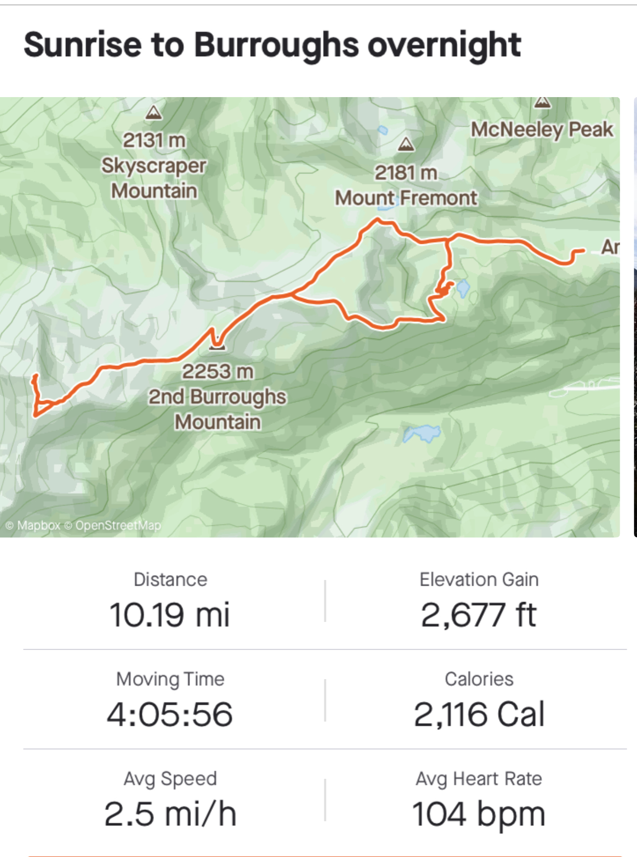 Sunrise Camp is only 1.5 miles from the parking lot. This was possibly the shortest backpack trip ever. We parked in the lot designated for backcountry permit holders and set off. Our packs were already packed. The weather was partly cloudy with moderate temperature. We made our way to Sunrise Camp, picked a spot and set up our tent, ate lunch and were off on our day-hike to the Burroughs around 1PM.