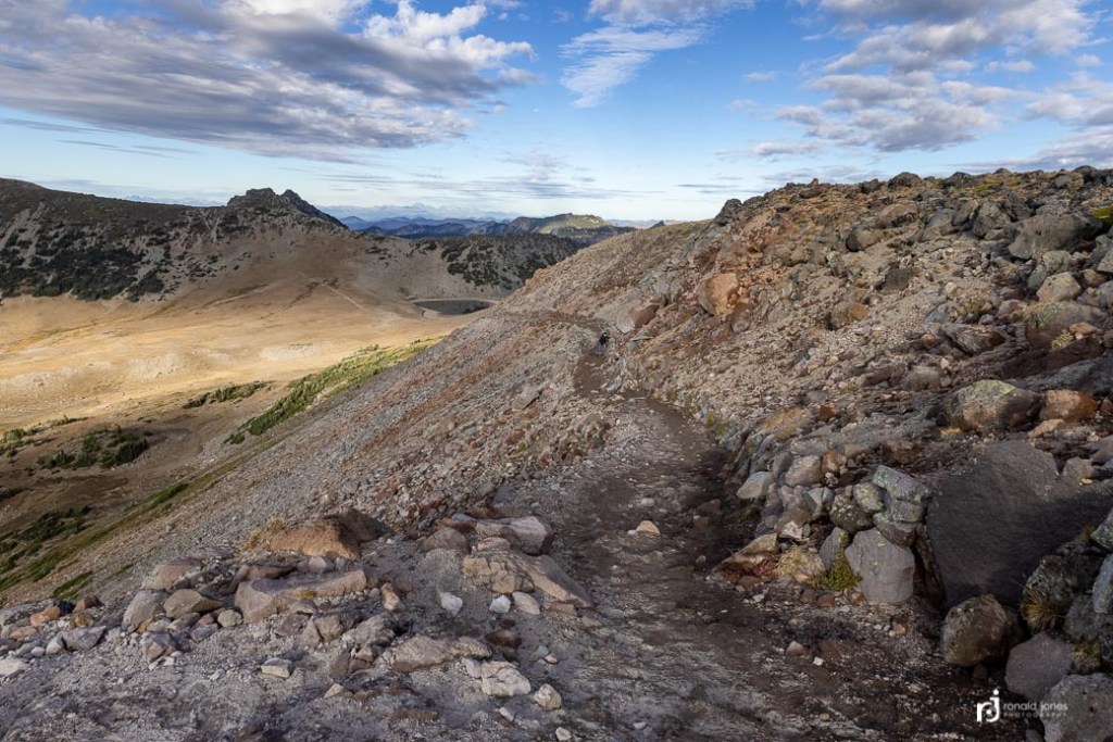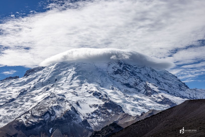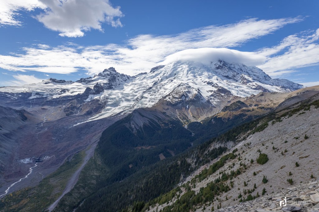 We kept a solid pace hiking up the Burroughs. By the time we were headed up, quite a few were descending. The entire hike keeps you in view of Mount Rainier. It proved to be a difficult day for photography since we were hiking into/facing the sun. The mountain was ensconced in a lenticular all day. It’s fascinating watching the lenticular swirl. At times it appears it may stretch way out as the cloud stretches away from the mountain, but it always remains just a cap – just a lot of shape shifting.