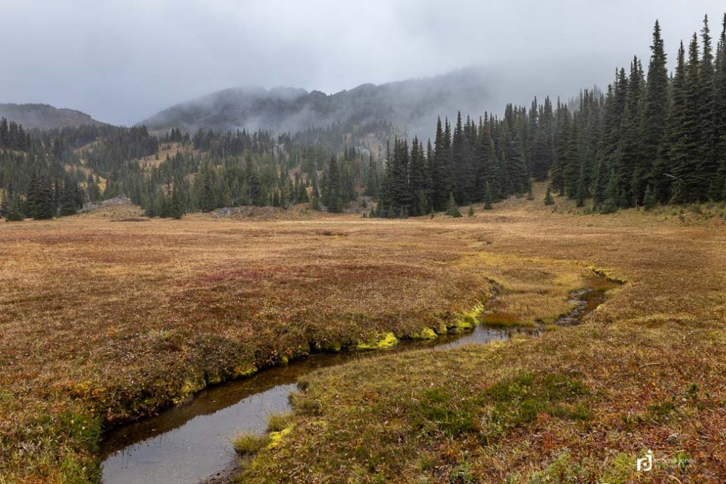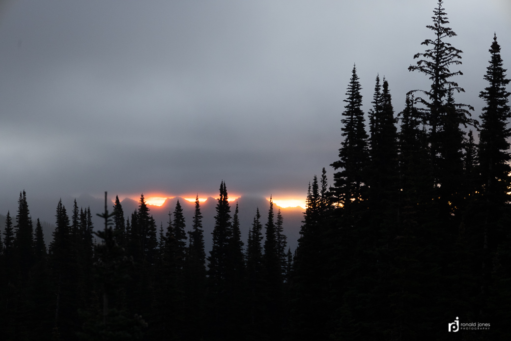 We took a leisurely morning. I was going to get up to Sunrise viewpoint for civil start (blue hour just before sunrise), but accidentally snoozed too long. I got up there shortly after sunrise, and the light was already hitting the mountain and clouds. But there was a lot of cloud cover east, and the mountain was mostly covered, so I actually didn’t miss much. I got a few shots, but not quite what I was hoping for. Back to camp and we had breakfast, packed up, and took yet a different trail back to the parking lot. It was misting a bit as we hiked, the surface clouds were starting to burn off. By the time we got to the Sunrise Visitors Center (closed for the season), the Mountain was starting to show itself.