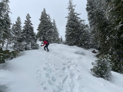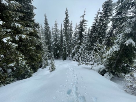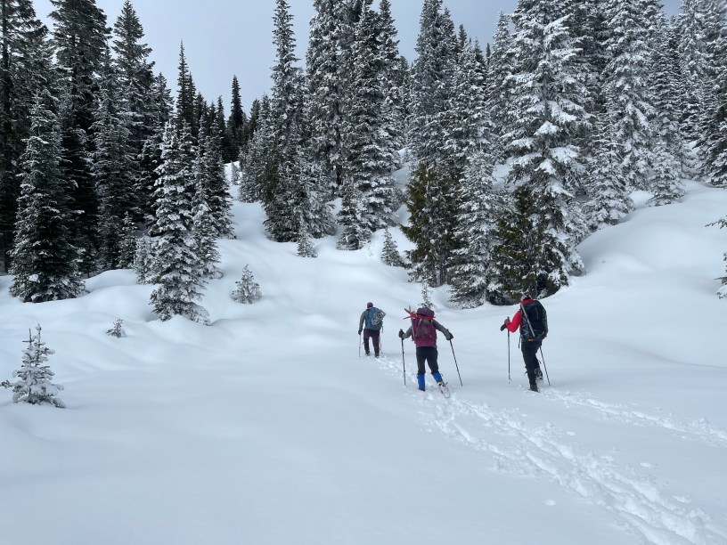The access is up the Dosewallips Road from Brinnon. The road terminates where it washed out many years ago. There is about 2-3 miles of pot-holed gravel. Then a makeshift parking area. The trailhead is not well marked. It’s about Β½ mile hike up the old roadbed. There is a post, but the sign is gone. From there, the trail just goes up. I mean up! The winter storms of snow and wind in December 2021 caused significant blowdown. Fortunately someone has cut the big trees that fell onto the road. And some work along the abandoned road. It’s no longer maintained by the forest service, and trail crews have not made their way to the area in force yet. The trail itself has some blowdown that forces hikers off trail for short sections, but in my opinion, they aren’t that bad. The trip was quick to get underway, and then it is relentlessly steep, so I never got photos at the start or down low. We almost made the official 5050 Pass summit. Maybe 15 minutes away. We got to 4,980′, but had a 1PM turnaround so we stuck to our rule.