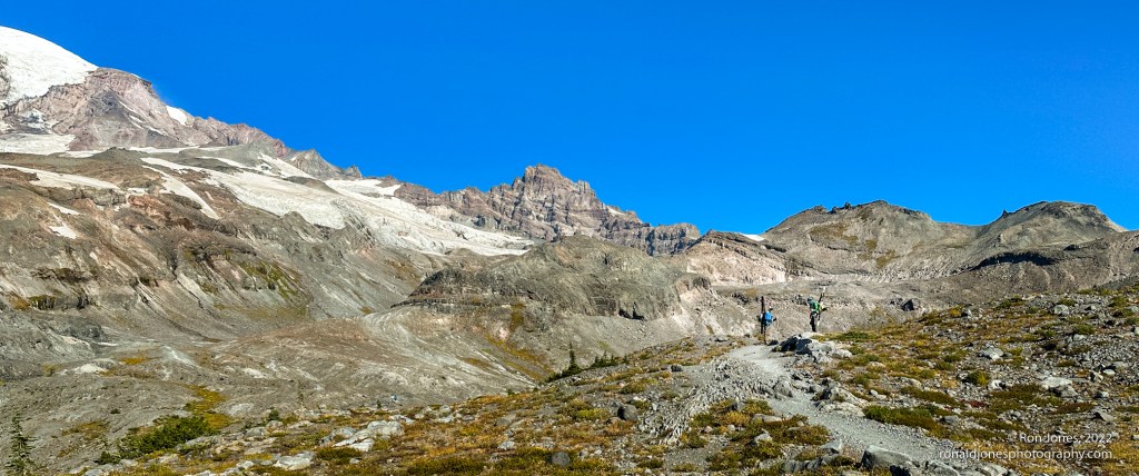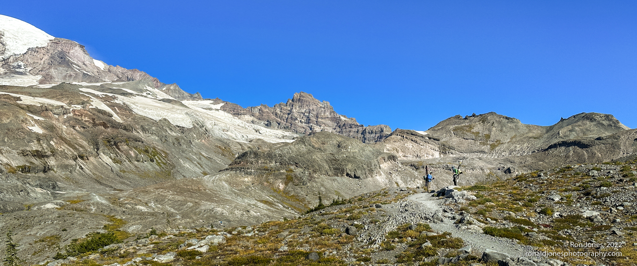 Taken on my return, but I hiked in the valley far left. The Paradise Glacier is center/left. The two skiers headed to ski the glacier. Okay! Good luck with that!