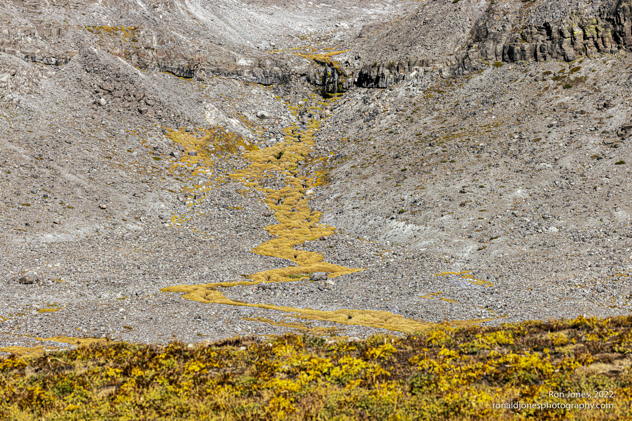 Glacier melt from high up the mountain, creates a riparian zone as it spans across the valley bottoms. A very interesting feature.