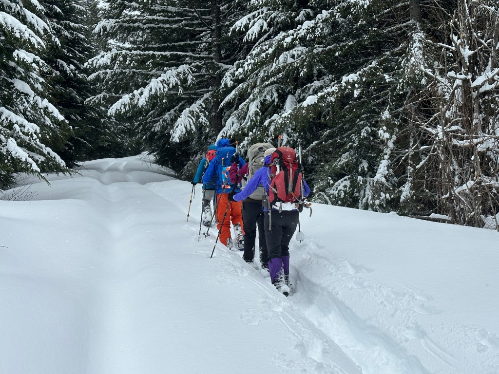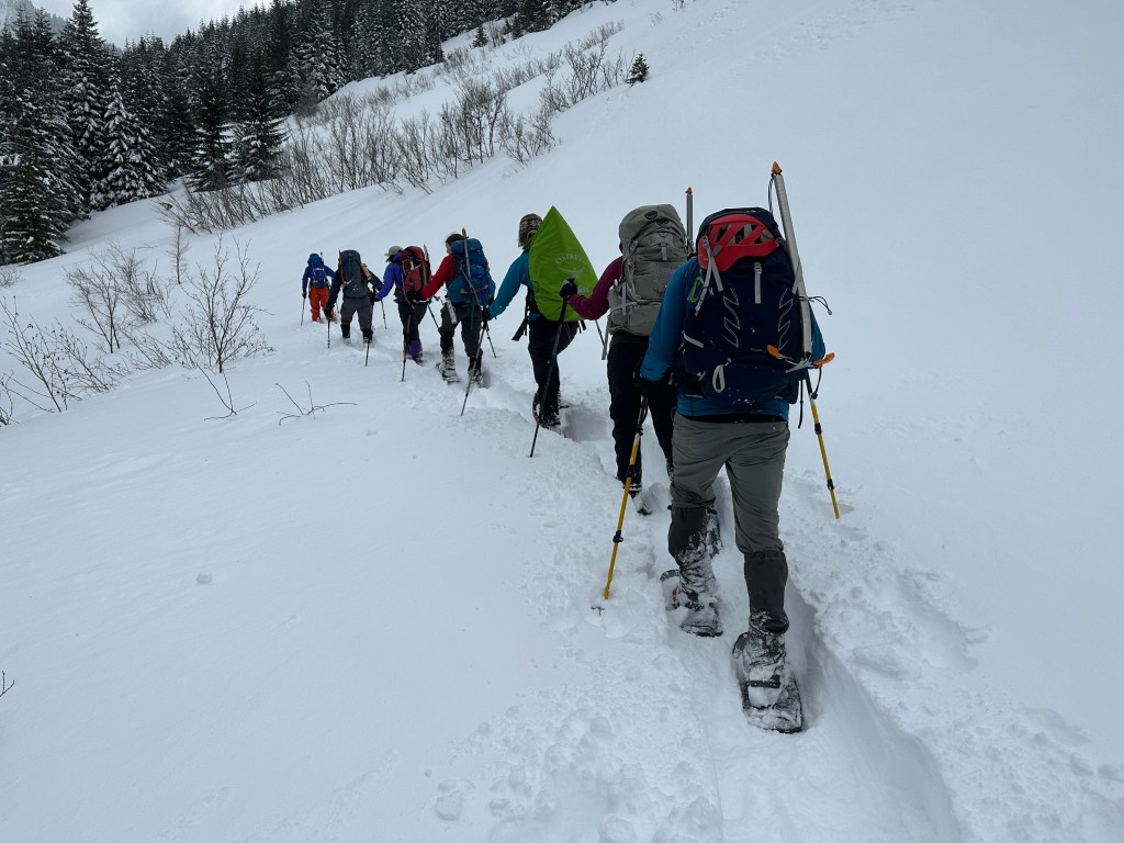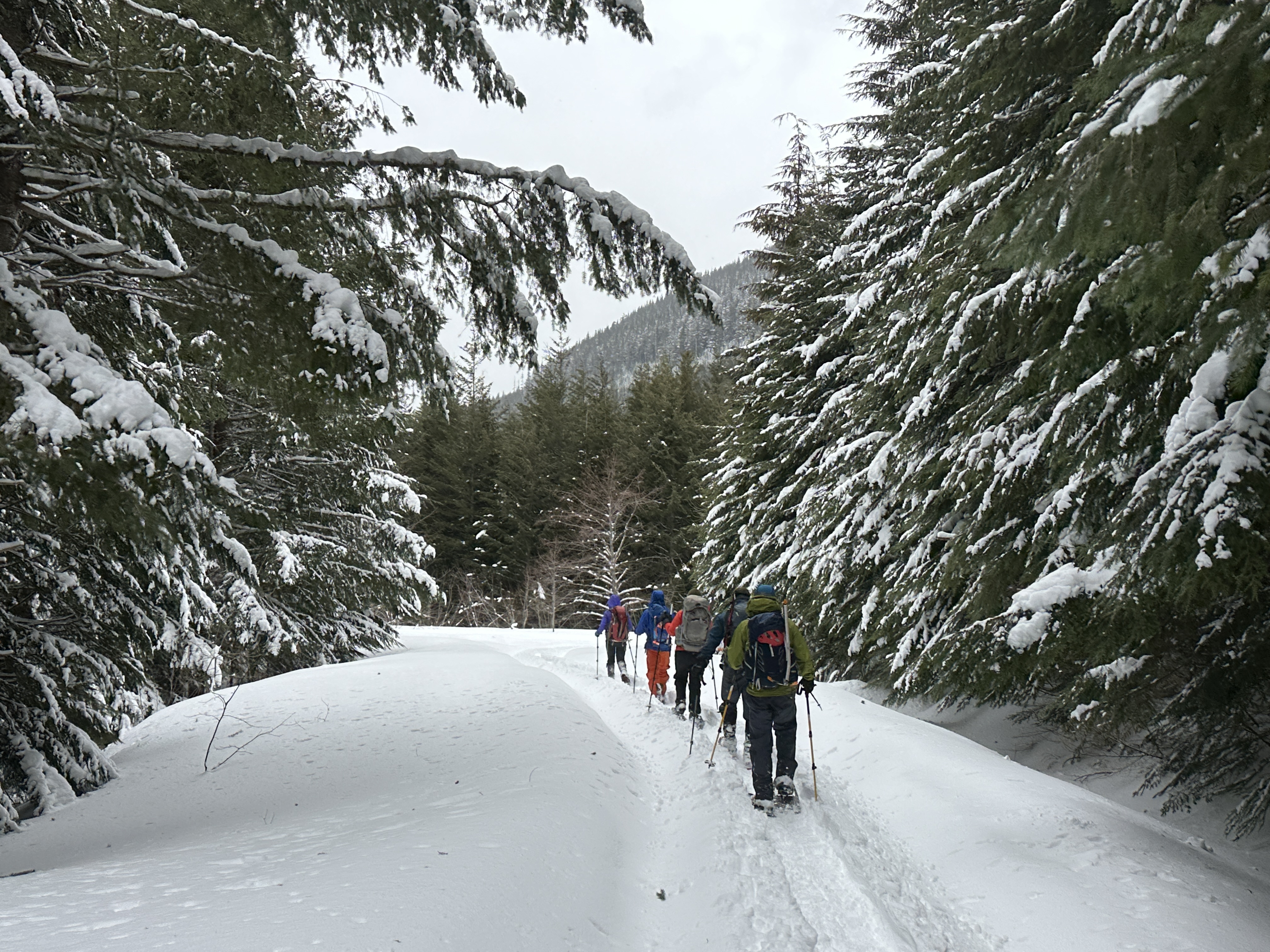 What took us almost 6 hours to ascend, took 3 hours to descend. Some of us carried all traction devices – snowshoes, microspikes and crampons. The only real necessity was snowshoes. For those of us who brought microspikes, they came in handy on the long road walk back. Which was a lot different with the warming weather and melting in the tire tracks. We traveled well together. After getting back to the old road bed, one member took the opportunity to make a snow angel (or rest in disguise of a snow angel!)