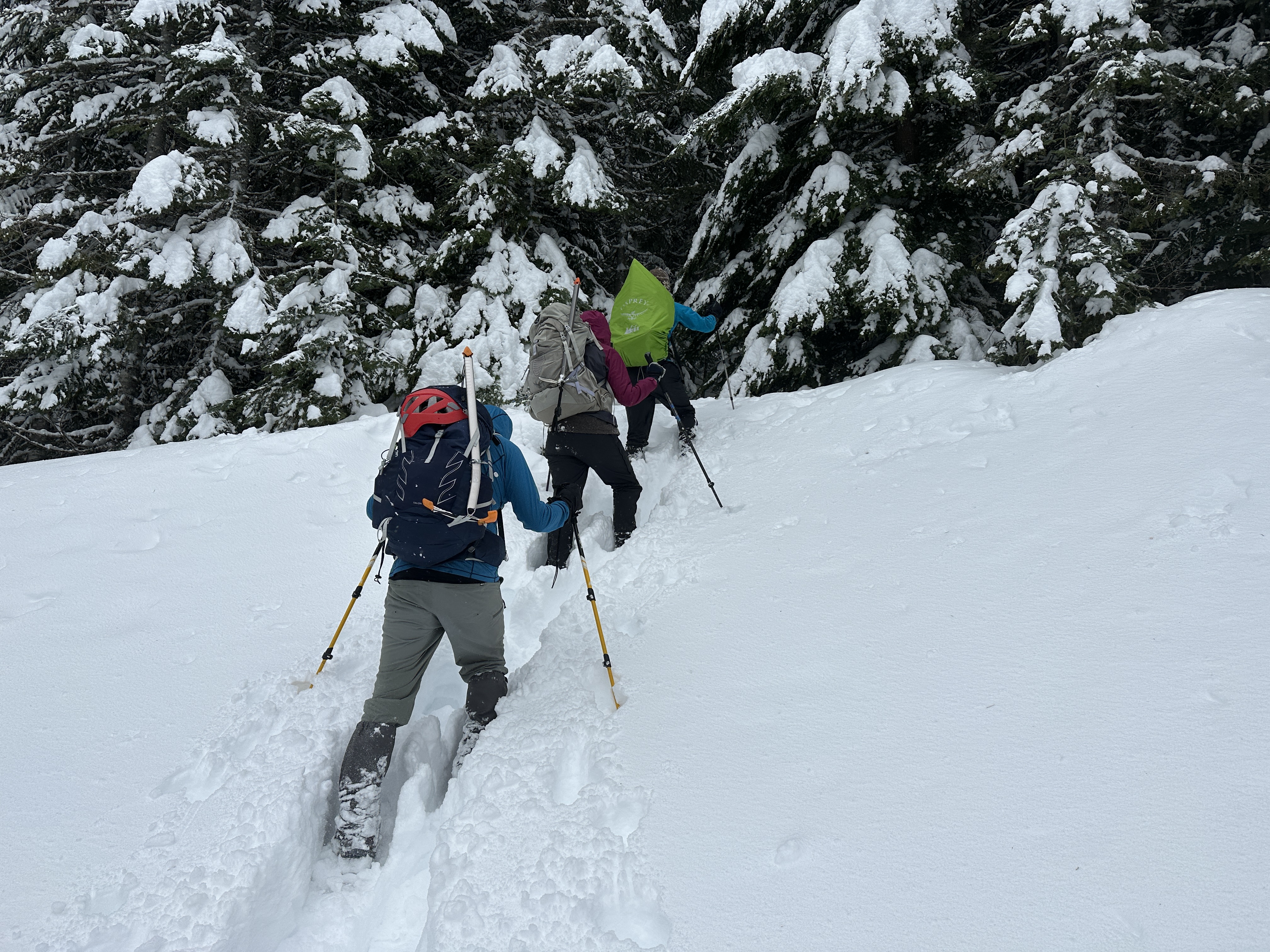 My Garmin watch gave me 9 hours 40 minutes total time, between 11 and 12 miles (depending whether choosing to correct the data or not), and just shy of 2,500′ gain. It was a good temperature at the start with about 6″ new on a good base. The winds gusted strong periodically, dropping snow out of the trees. We all bundled up while ascending the ridge. It was cold if not moving. Only occasionally did we have very light snow flurries.