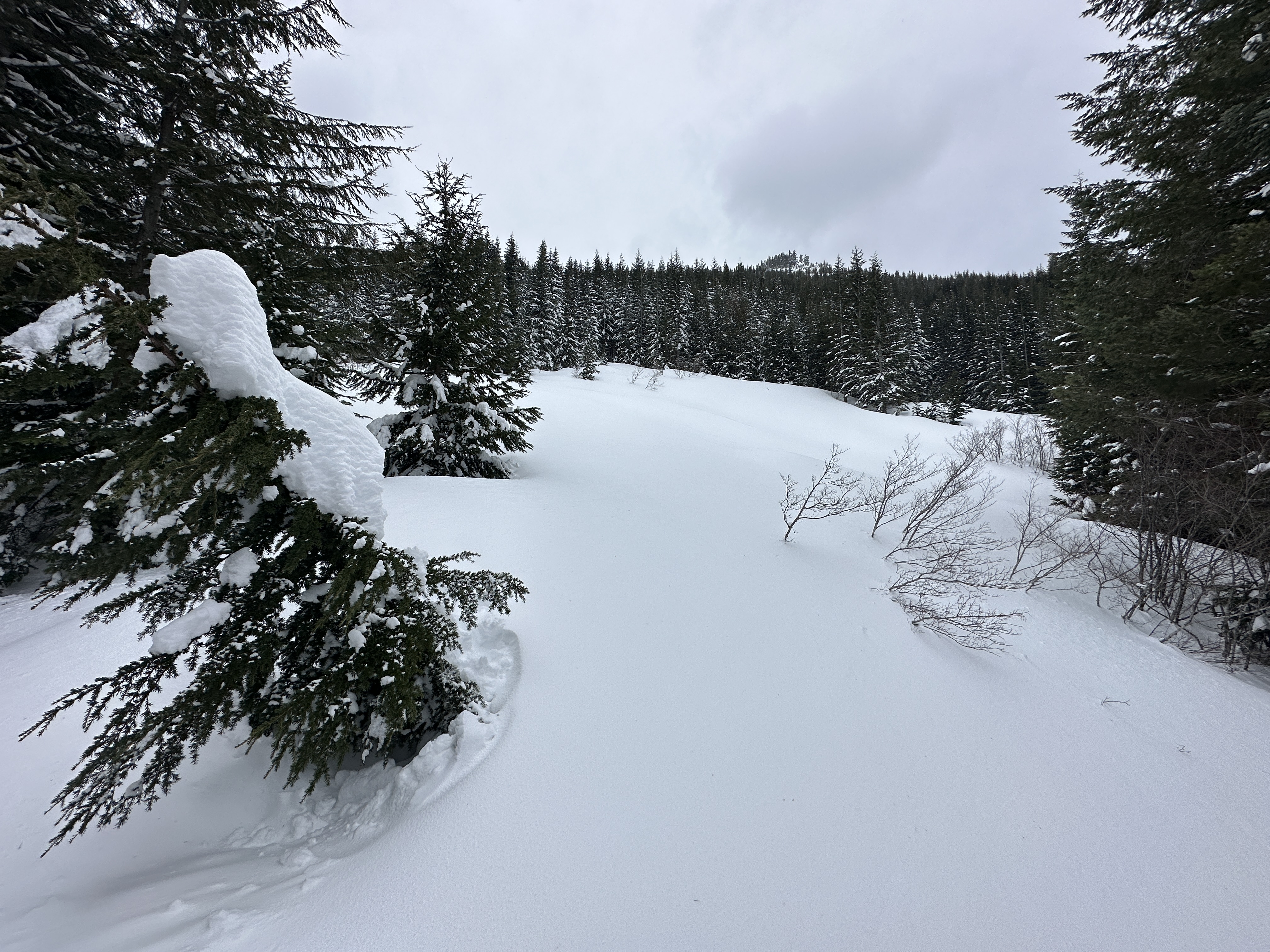 No good photos from skinny tree area. This one is just before getting back to a better area. We were often plowing thigh deep snow on narrow and deep snow ridges between tress.