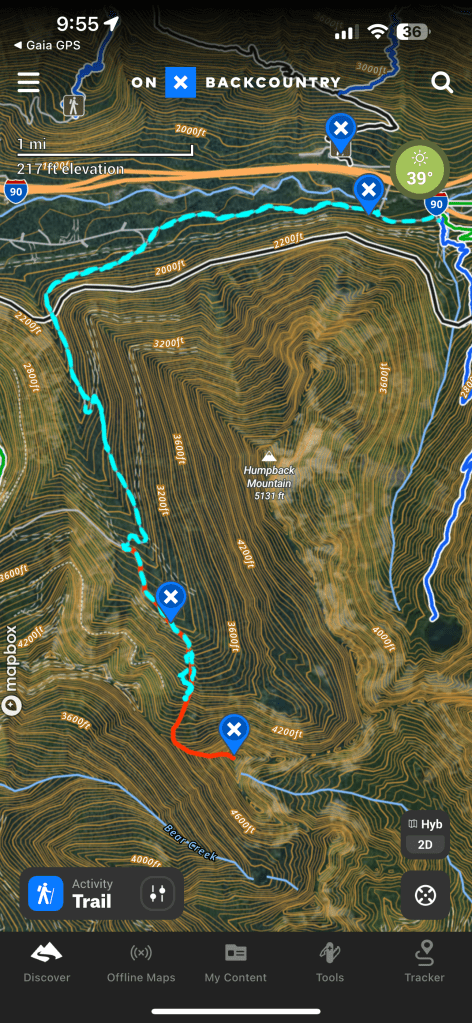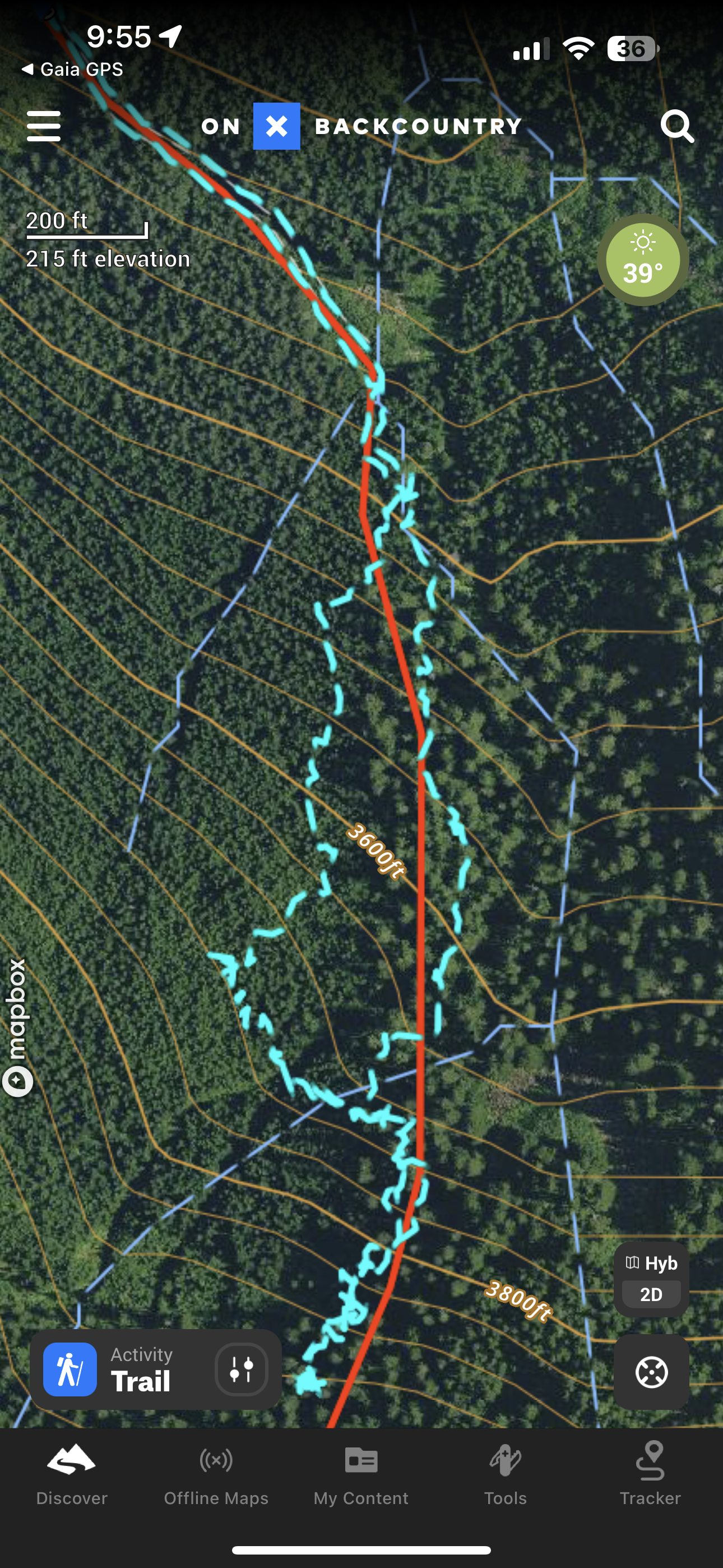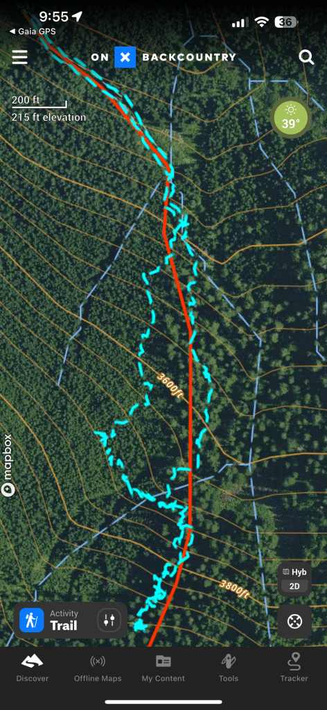 The images below show our track (light blue), and a track from a previous attempt by another scrambler (red). The close up view from onX shows the fine line between big tress and skinnier new growth. We stayed in the bigger tress on the descent.