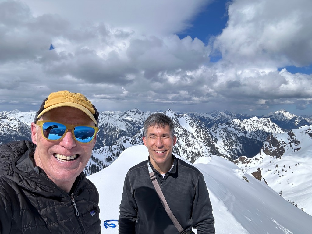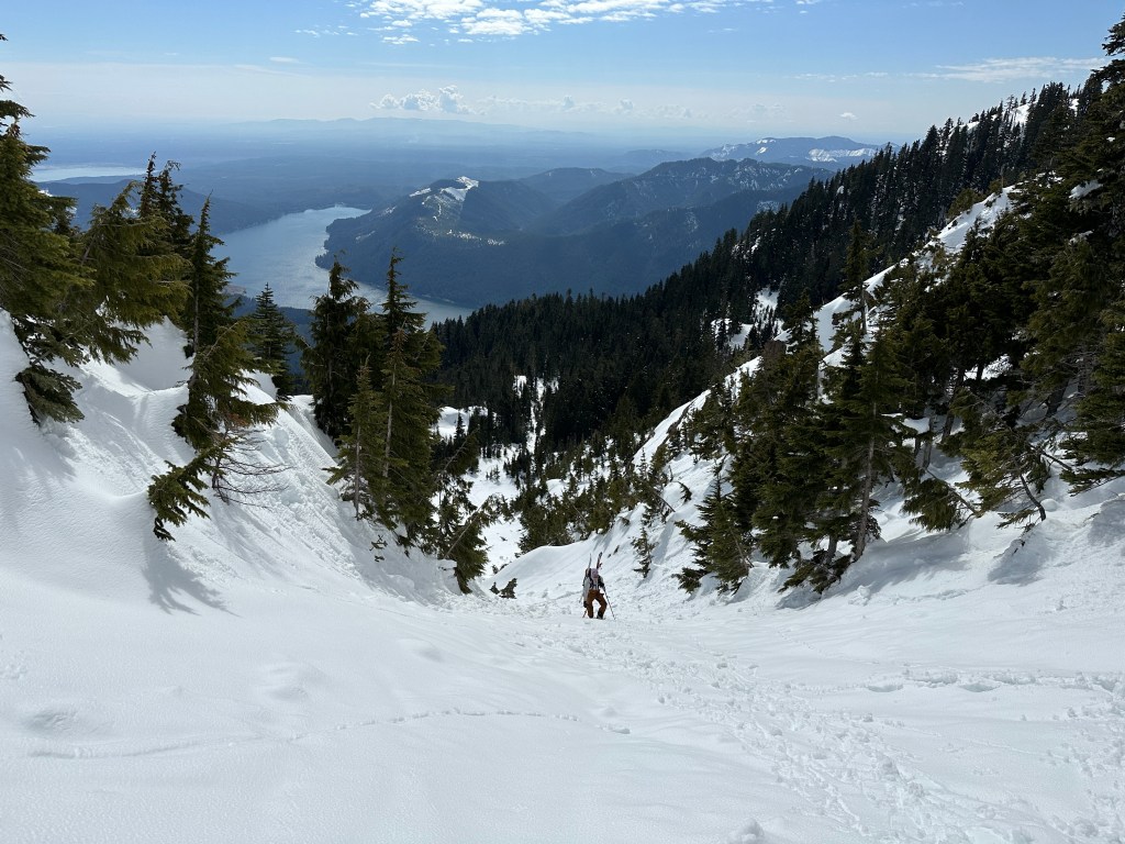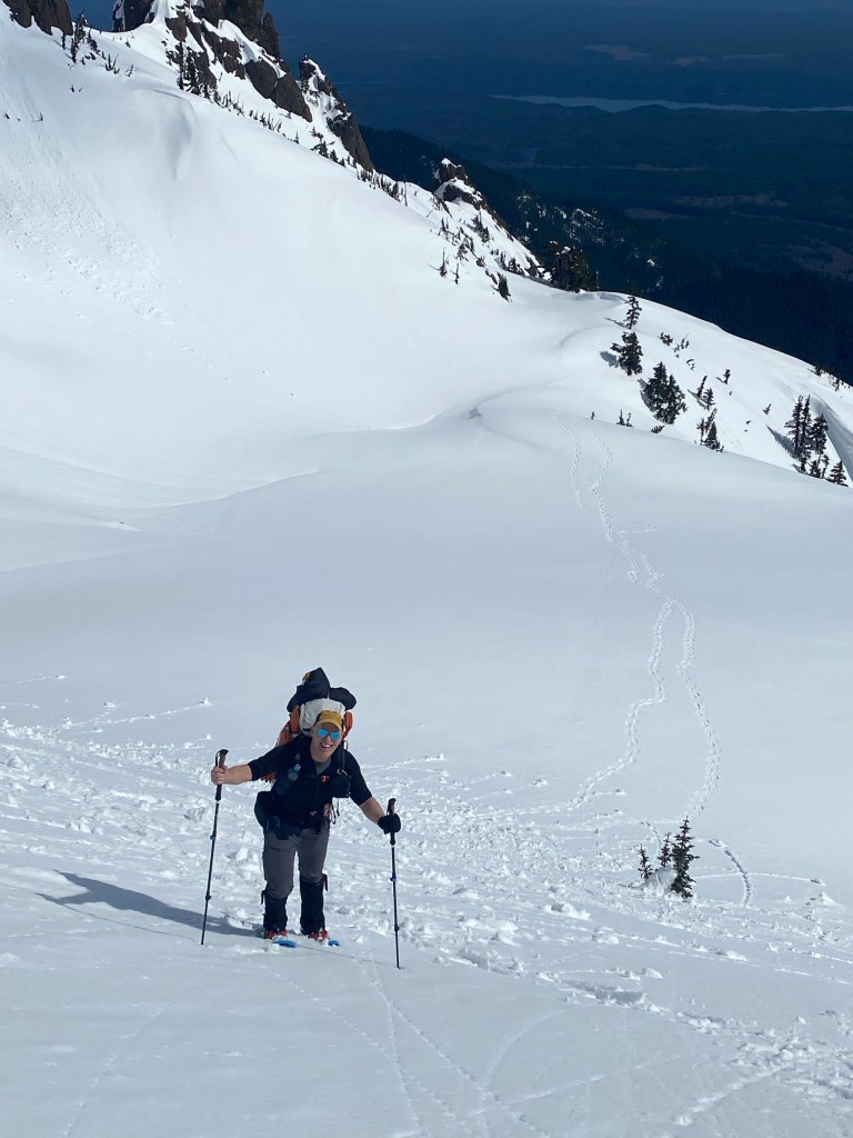 As we approached the chute one skier had gone up a ways. The other was putting his skis on his pack, getting ready to boot up. We ended up passing them and never saw them again. Hikers who summited just after us said they’d turned around. We expected as much since the second guy was really struggling in the deep snow. It was either snow shoes or post hole to your knees or thighs.