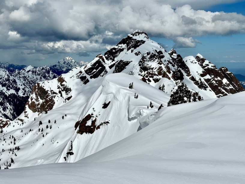 As we approached the chute one skier had gone up a ways. The other was putting his skis on his pack, getting ready to boot up. We ended up passing them and never saw them again. Hikers who summited just after us said they’d turned around. We expected as much since the second guy was really struggling in the deep snow. It was either snow shoes or post hole to your knees or thighs.