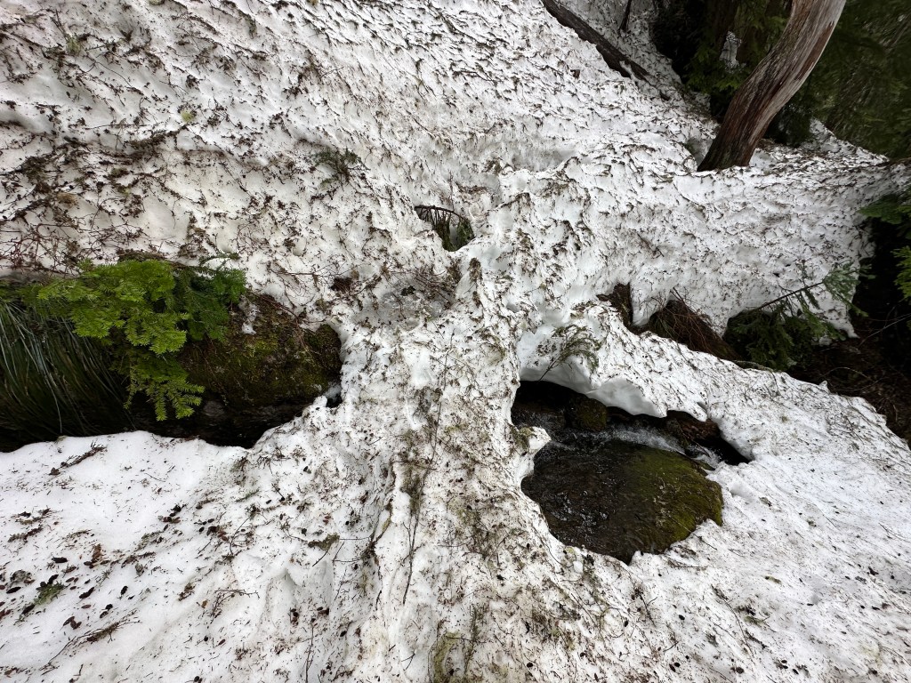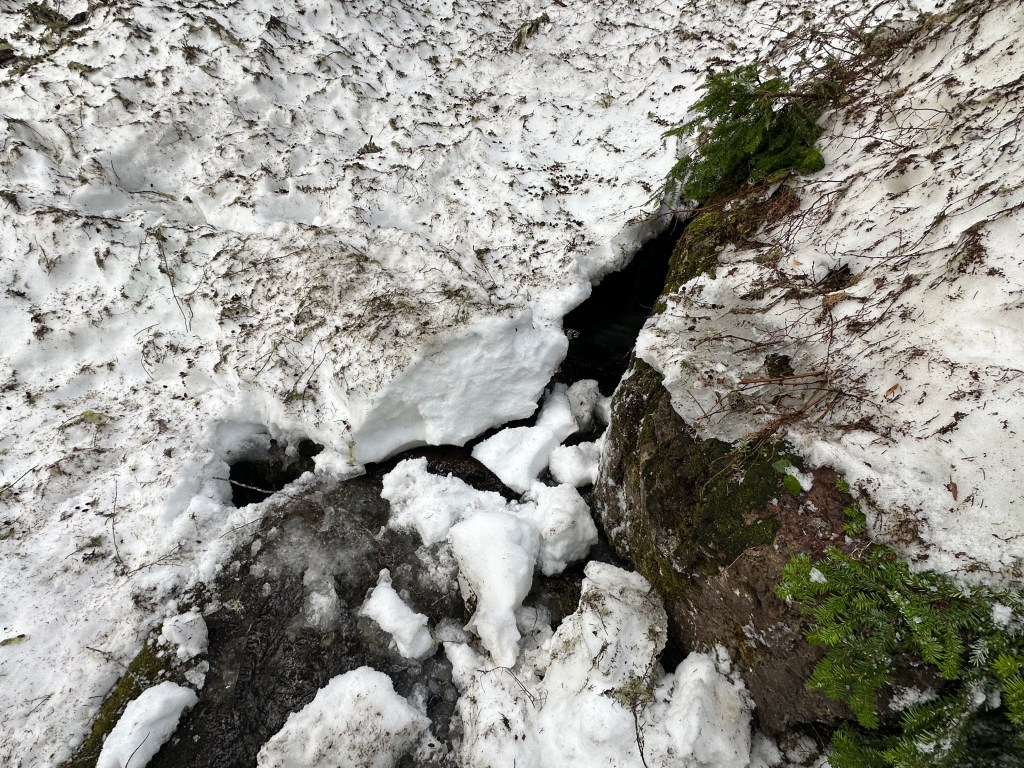 After a snack I headed down and ended up collapsing the snow bridge over the creek. I’d walked over it in the way up after testing it. I tested again but I must have stepped too hard, causing it to partially collapse. So I went ahead and knocked it down completely. It’s not a danger other than a possible rolled ankle, skinned shin or something that’s not a drowning. It’s not a raging river or deep.