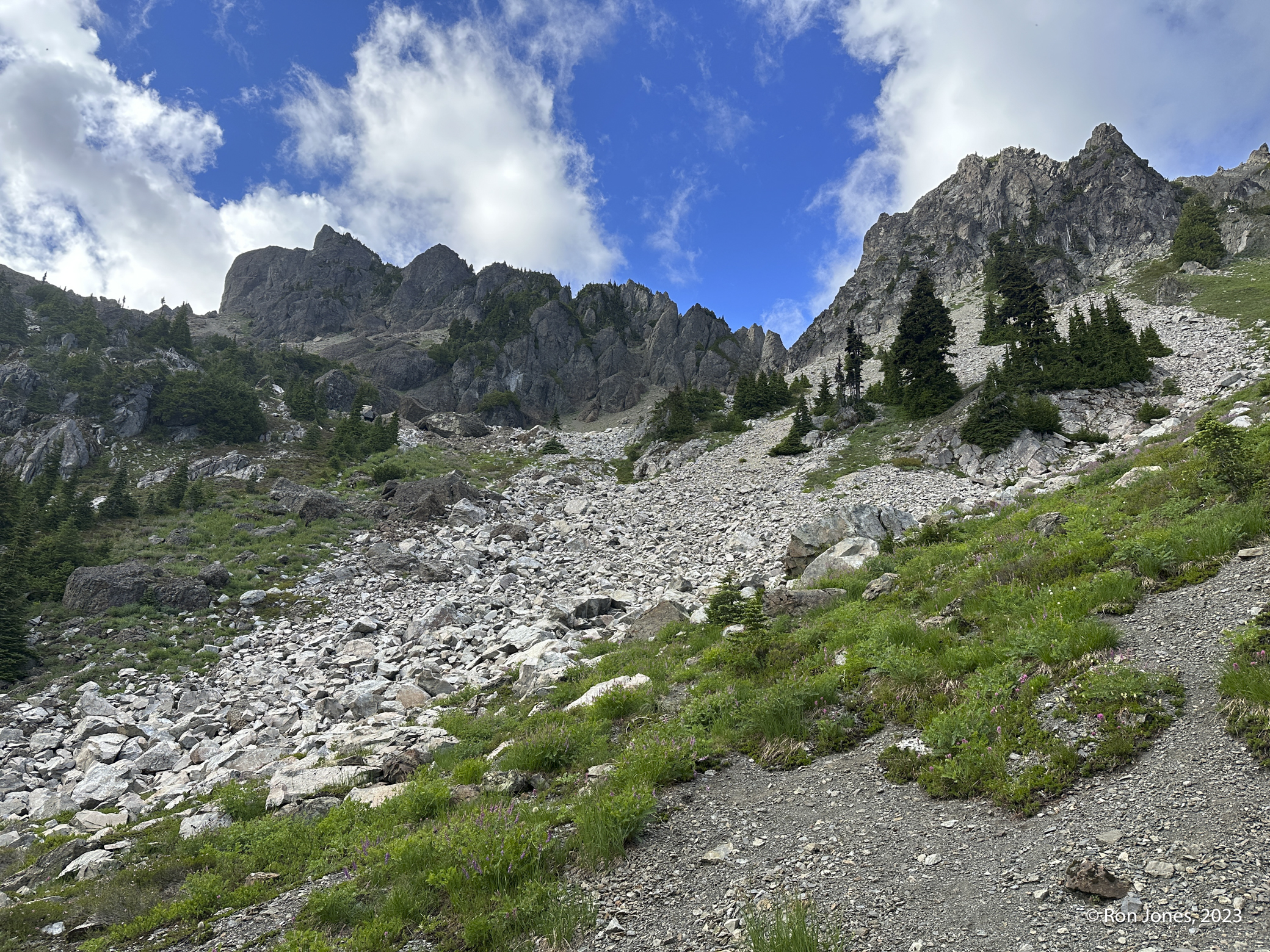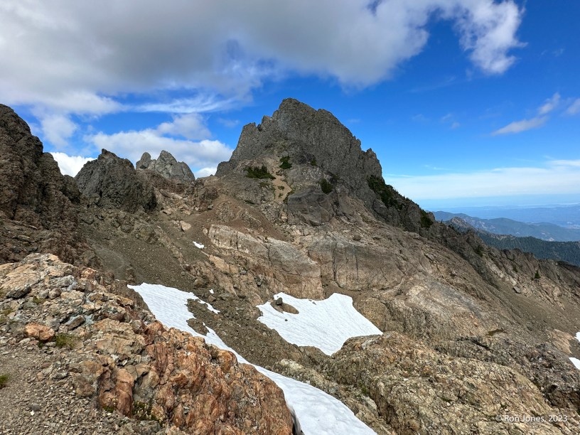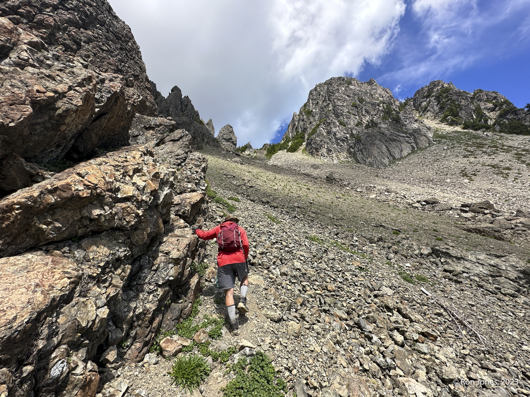 We left the water fall at lake of Angels and took a direct boot path/game trail that intersected with the main boot path headed to the Pearly Gate. This was a steep, loose path. Just as the cliff band was approached on the left, we found an obvious booth path. Similar to Skokomish, we contoured up and across. Lots of loose stuff. We found a spot where steps were set into more of a drift vegetative landscape next to scree/talus marbles. We took this path but also tried to avoid it at times because more traffic here is causing erosion, which seems like it will end up as just loose rock also. And like Skokomish, we found a better path on the return through talus. It would be a better path up. Eventually the boot path contours around and goes up a couple narrow chutes. This felt like we were gaining the summit but it dropped us into a bowl with snow fields. Easy to scramble above any snow. The haystack summit block in view and somewhat ominous. The route is described in a photo caption below.