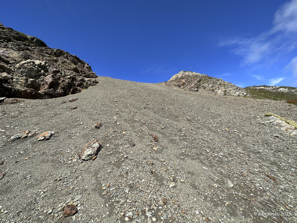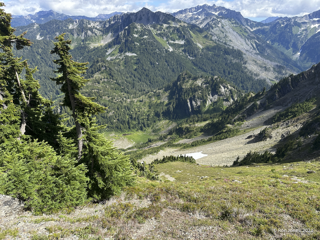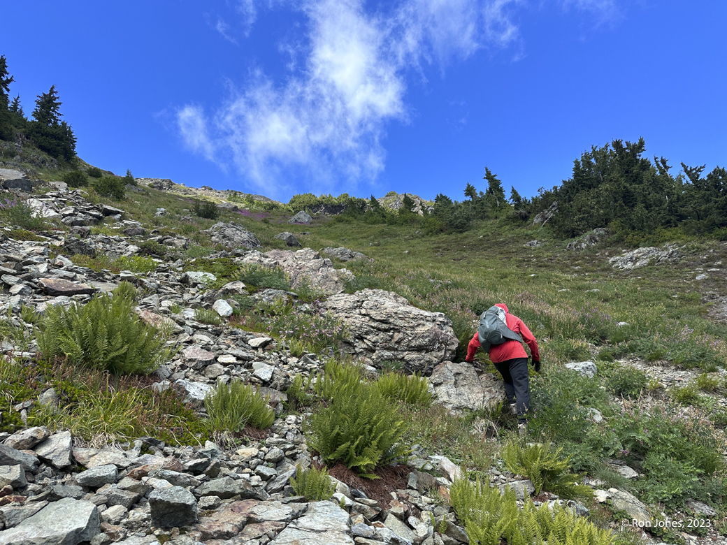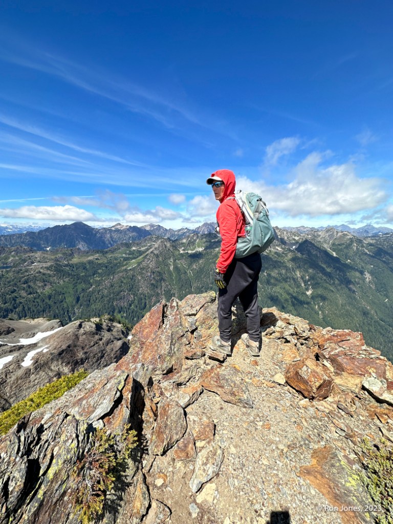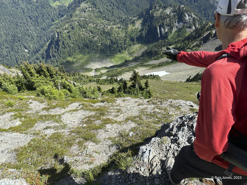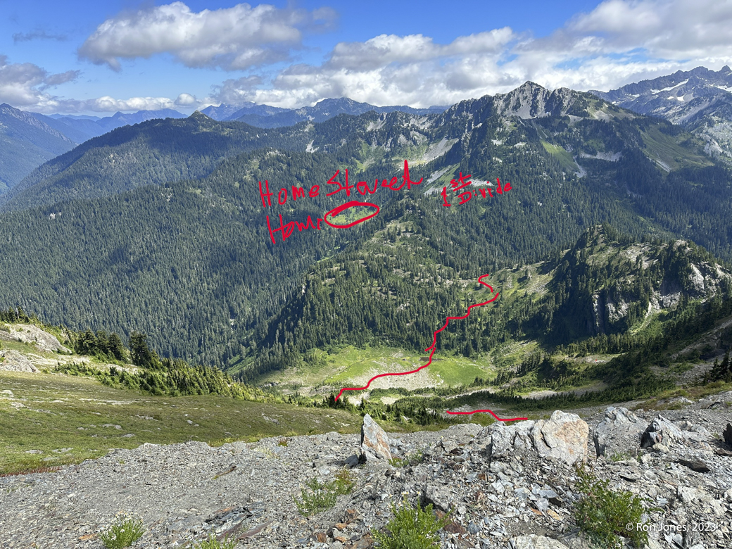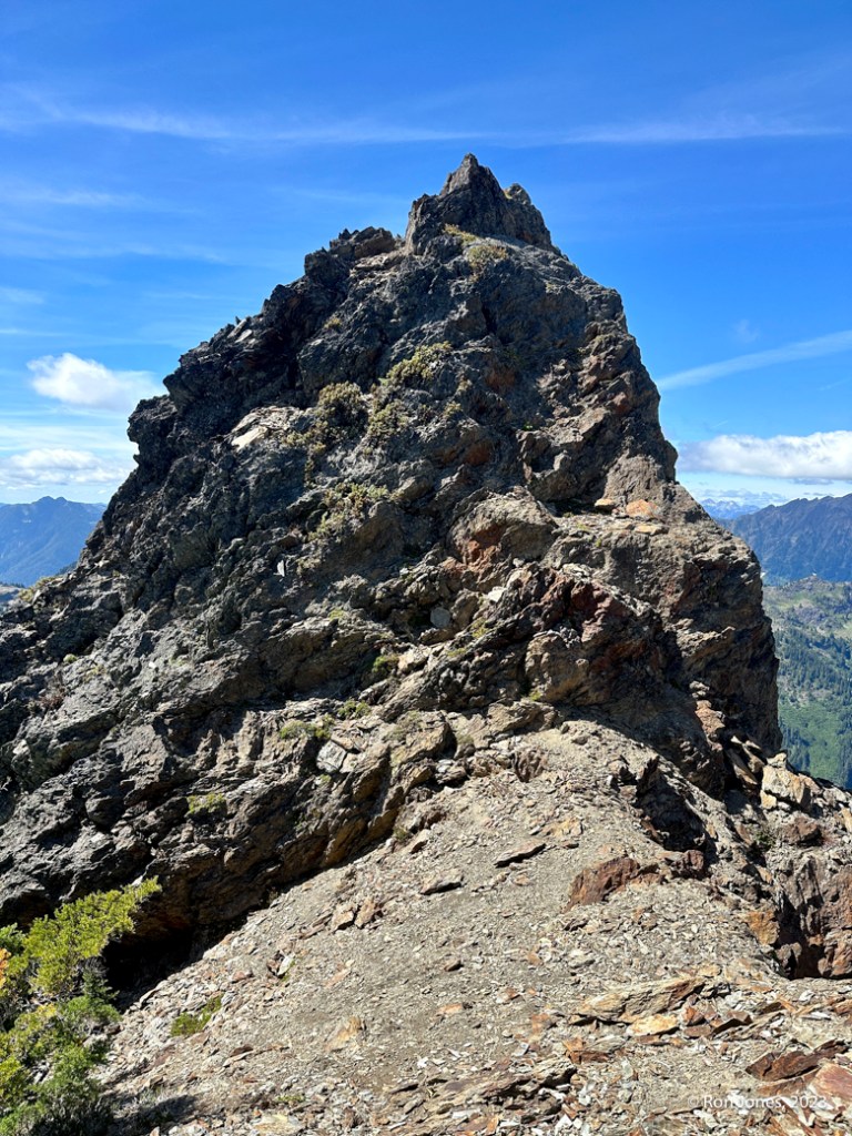 The off-trail scramble to the summit took us 5 hours round trip for less than 4 miles by way of garmin. Some brutal bushwhacking, long talus/scree field, then the upper sub-alpine meadow complete with bear crawling at times. A few little dicey moves on some horribly rotten and chossy rock to gain the final approach. The actual summit was a cake walk on small shale scree. After the summit where we once again, found no register, we went to check out the south summit. It has, in my opinion, serious exposure. It was 2PM. We were tired, and decided we didn’t need to risk it. Maybe another time. We decided to descend what would would have been climber’s right instead of the climber’s left, which is how we came up. It was a lot better. On the way up, I realized I’d forgotten my helmet at home, and really would have liked my microspikes for the veggie slope. We’ve been doing our scrambles in trail runners because of the long approaches. They work fine. Frankly, I prefer them over boots 90 percent of the time. Just occasionally I might want the ability to kick a dirt step.
