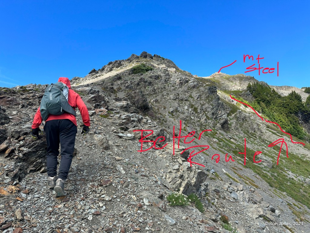 Fast forward one year and we’d already done some longer scrambles. Henderson in a day. And then Skokomish AND Stone in a day. Read about that one here. The big difference with Steel is the 12.5 mile approach from Staircase to the saddle before 1st Divide that gains about 4000′, most of the gain coming after reaching Nine-stream which is about 9.5 miles in. I didn’t take but a couple pictures of this area on this trip. It’s all trail and easy to follow. Similar to many of our trips, on this one, we camel’d up at streams and only carried water for the off-trail portion, which we got in the basin below Mount Steel.