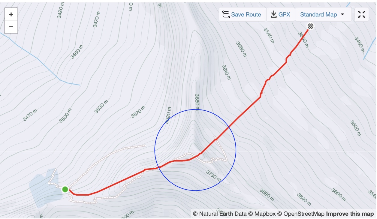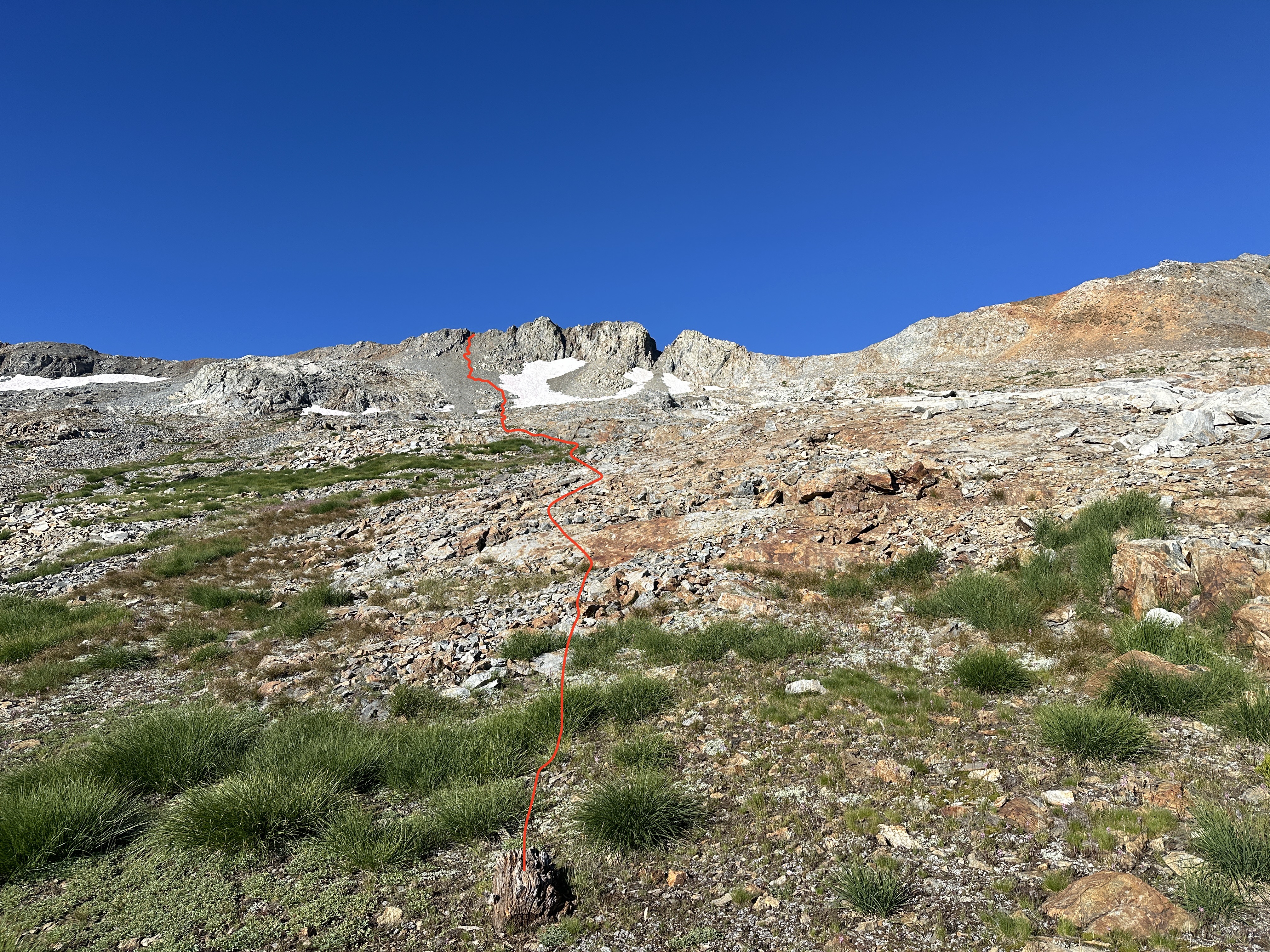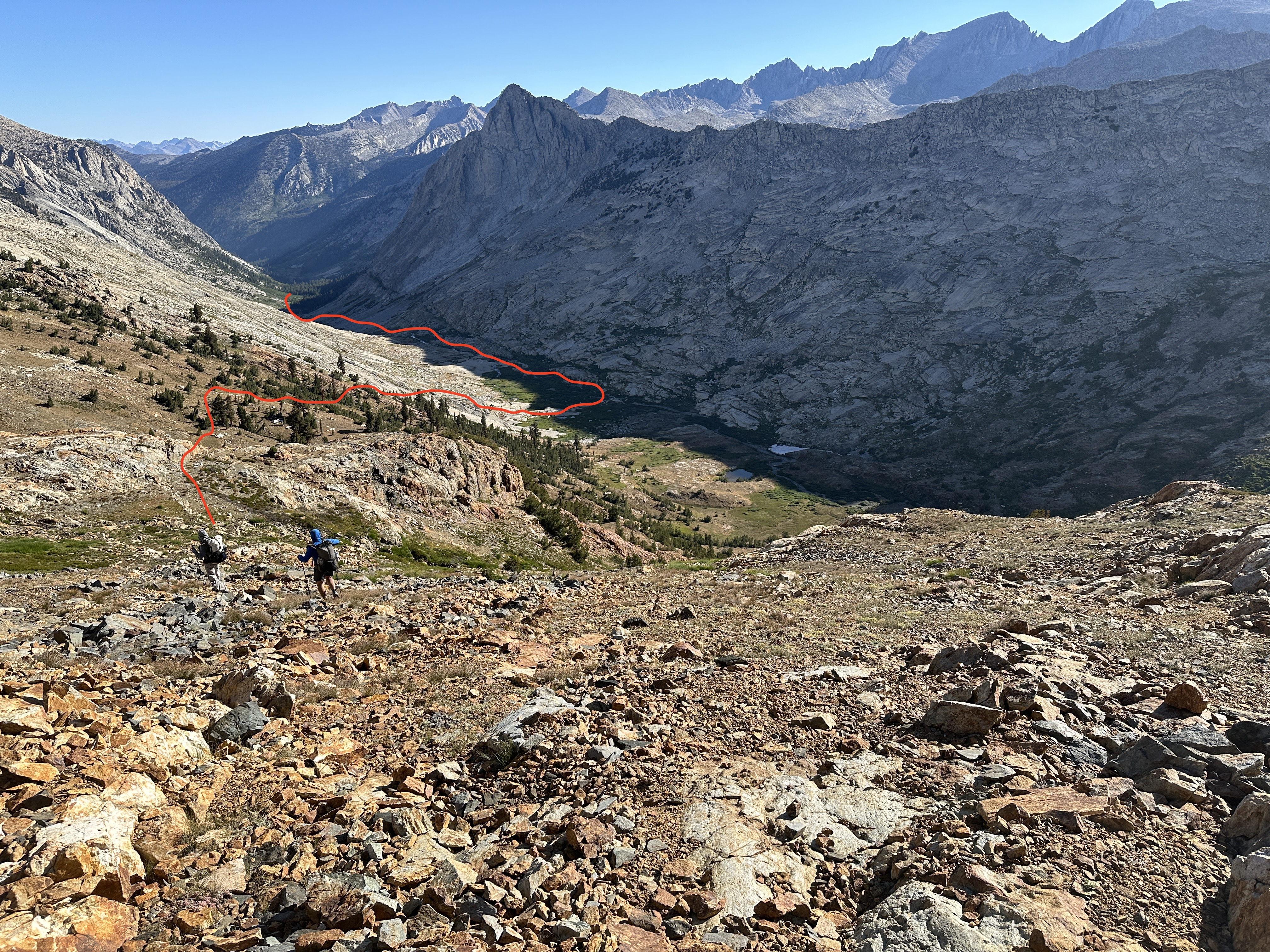 Looking back up from where we came over and down the night before. The path is drawn in rough proximnity. I walked all of it alone, and 90% by headlamp, with only the headlamps of our team in the distance to guide me. I had a track/coordinate to help if needed.