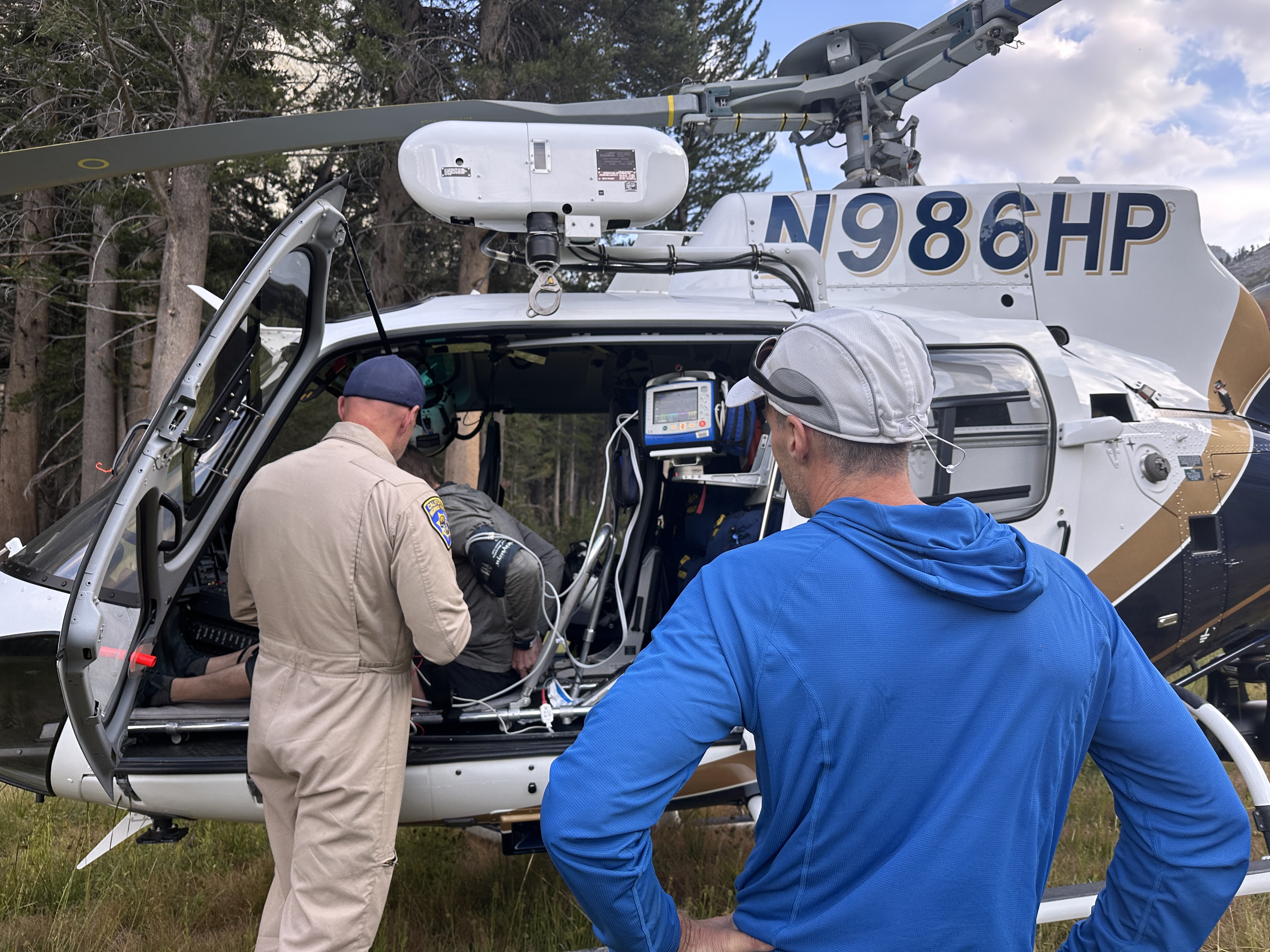 At around 6PM, a helicopter appeared overhead, circled and landed. It turns out the California Highway Patrol performs many rescues in the Sierra. One officer said they average one per day during the summer season. They were proud to be flying a new helicopter, with only 300 hours on it. Said they would have announce to us they saw us when they first flew over but the bull horn speaker wasn’t working.