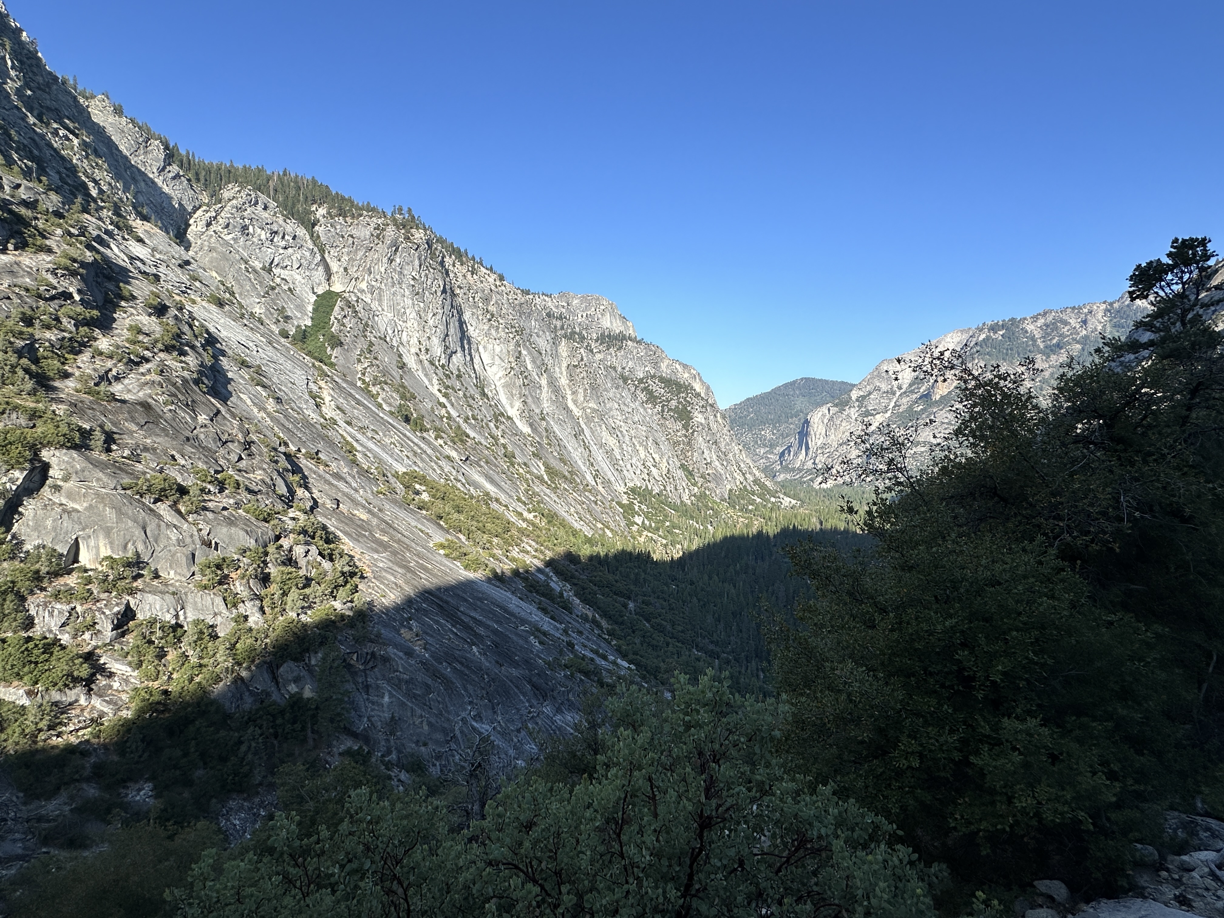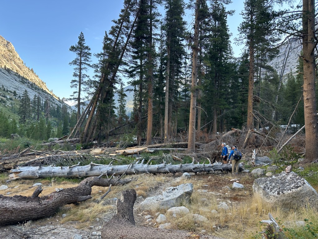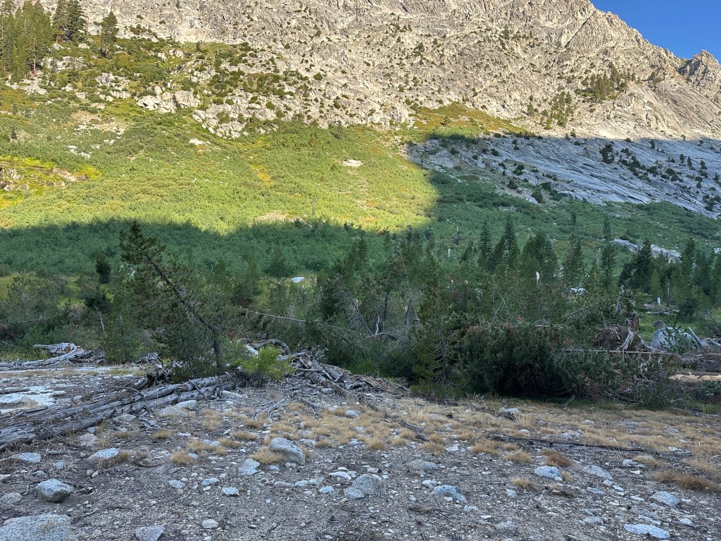 The day after D was evacuated, the three of us set off down Cloud Canyon following the Roaring River. It was 7 miles to the ranger station, which was not staffed when we got there around noon. It was so HOT. Oh my. It was a really pretty hike down. In a valley with a fair amount of brush. We were lucky and didn’t get a lot of bug activity in that area. There was so much avalanche sign with trees sheered off about 10′ from the ground.