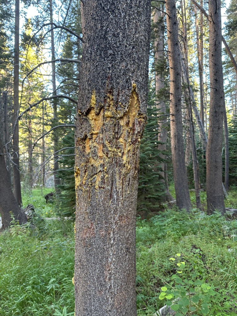 After a nice break in the shaded heat at the ranger station we began the ascent on trail to Avalanche Pass. We had to climb to just over 10,000′, a gain of around 2,500′, then descend about 1,500′ to where we hoped would be decent camping. The climb up was hot in most places. It was steepish at first, then mellowed at an easy to flat gradient, before getting steep again near the summit. We were able to get some water along the way. It was a tree’d summit.