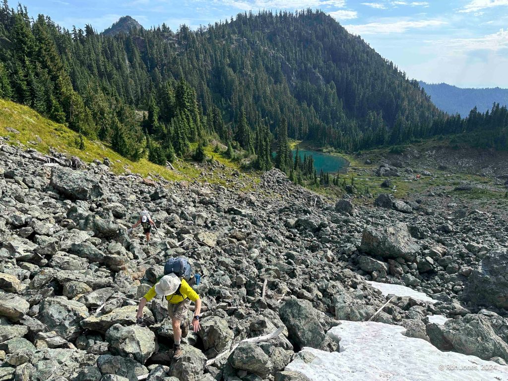 We took an extended break and enjoyed the time at the lake, and discussed the option to scramble Mt. Bretherton and Mt Lena. We quickly ruled out Mt. Lena, even though it would be on our way, because of southern full sun exposure. We were already feeling it. Our thermometer read 80 degrees. While Bretherton is a fun scramble, we estimated our arrival time at camp would be much later than desired so we opted to just continue to camp and be rested for day 2.