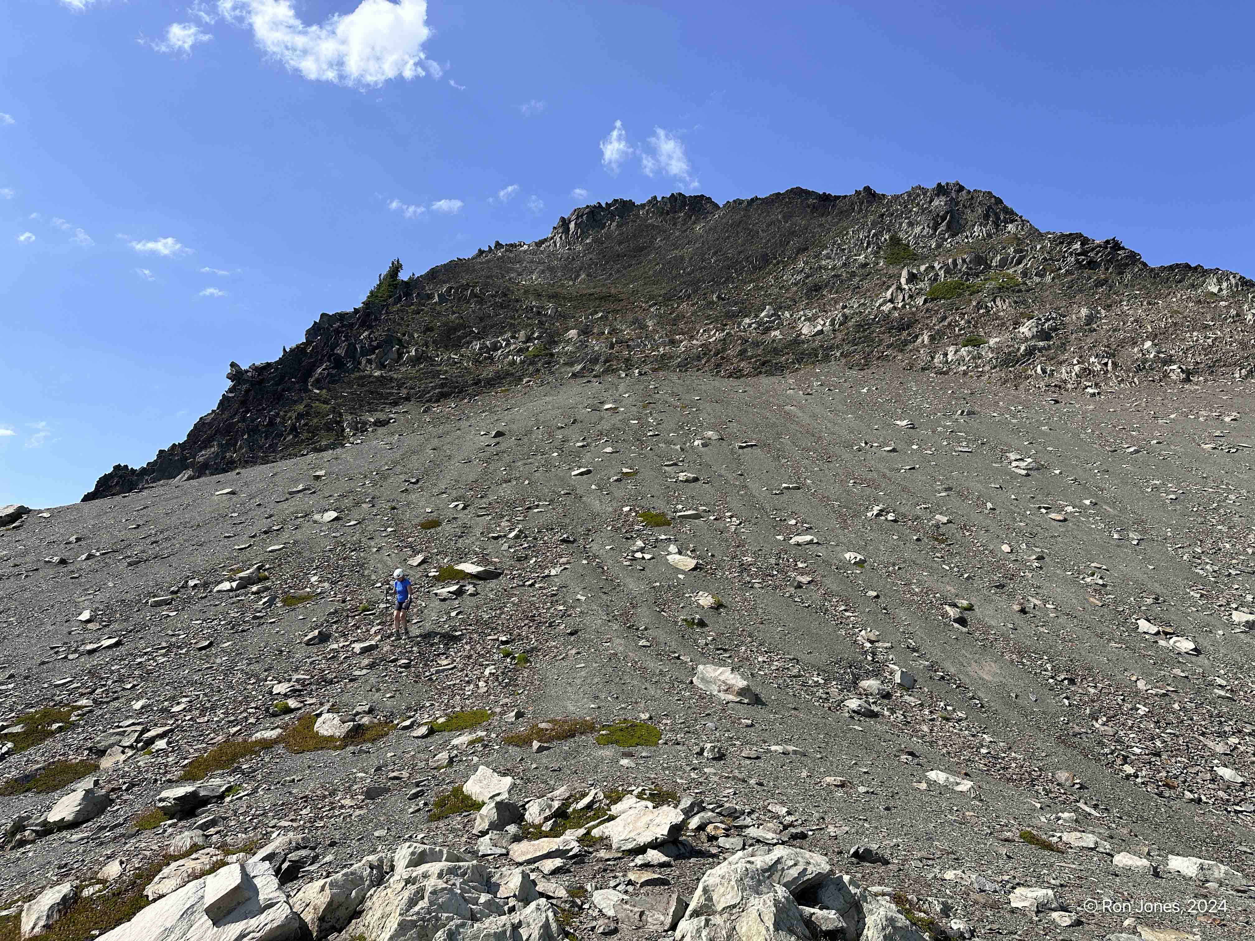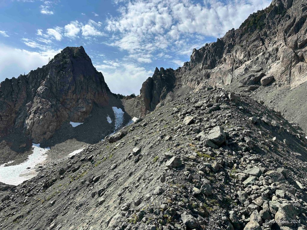 Nearing the end of the spine with the hidden snowfield that feeds the stream running down the edge of the talus.