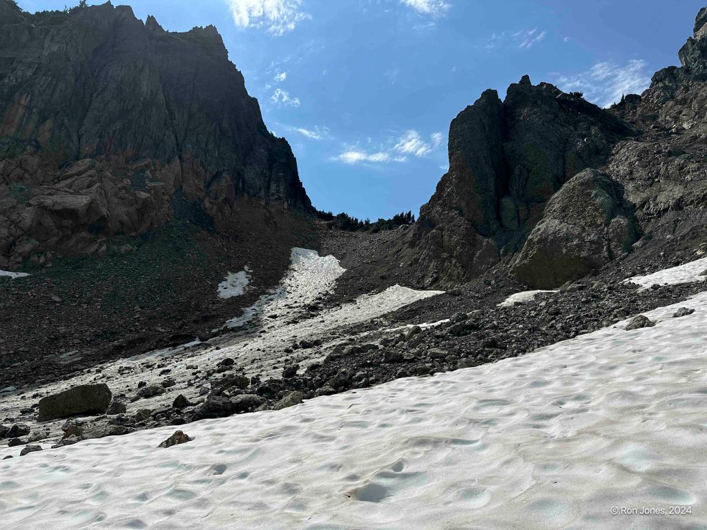 The preferred route this late in the season is to stay high and work across the top of the snow finger. It looks terrible but as you near you’ll find it not as intimidating. Last year we walked across the very top. This year looked icy clean. But we noticed later there was a nice dirt path above it. After the snow, angle and climb as the terrain allows.