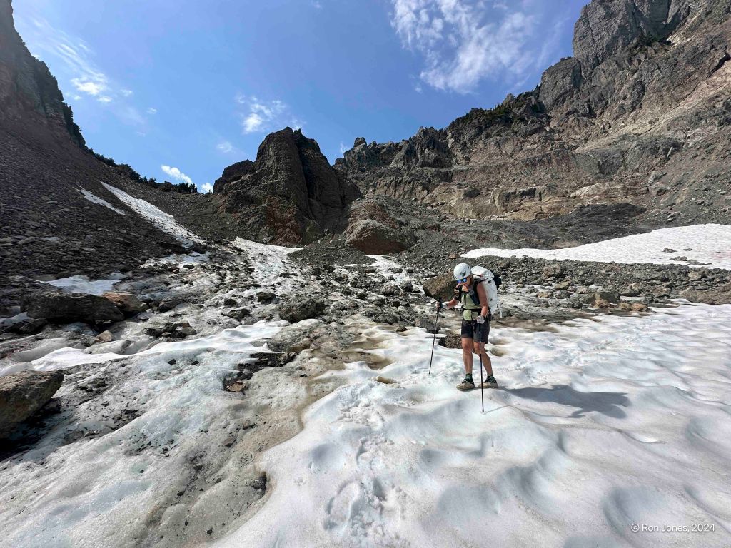 It turned out to be more challenging than expected. I’d done the full 22 mile loop last year in a single 16 hour push on a private trip. That write up is here. But the difference of heavier packs with overnight gear and food, heat, and even less snow made it slower. Last year my private trip went up the loose scree. We wanted to avoid causing rocks to rain down, so chose the spine on climbers right. It was the correct choice.