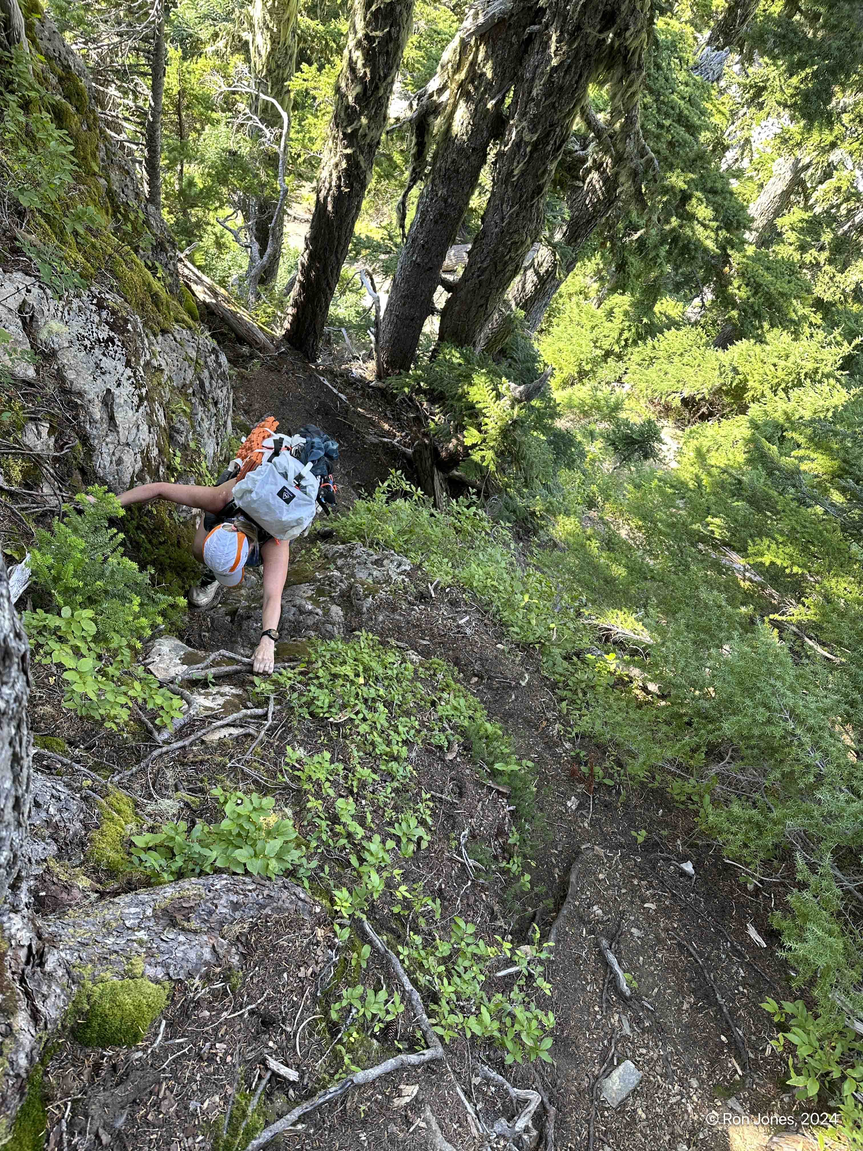 Climbing the ridge west of Lake of Angels was pretty easy. The downclimb to the other basin is a bit challenging. It’s about 15′ of near vertical root, rock and dirt steps that lead to another loose scree path, which ultimately transitions to a ¾ mile traverse to the saddle above Hagen Lake.