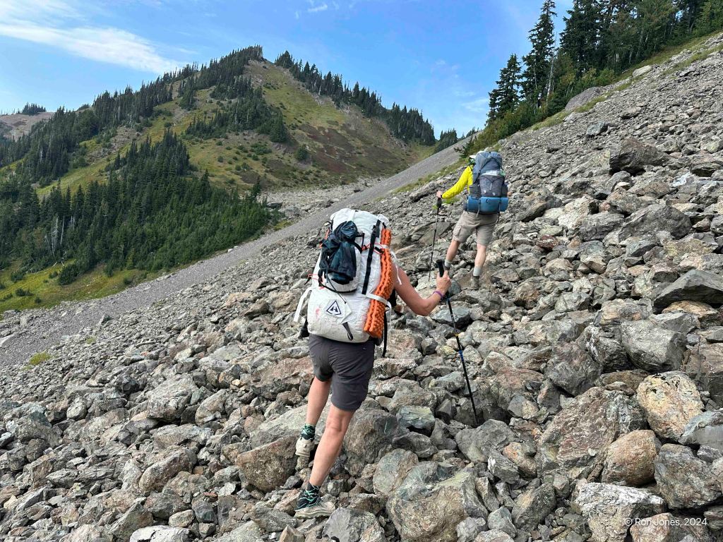 Most of the route is in great shape, but there are a few moderate to very challenging sections. It’s a mix of maintained trail, way trail, and then legit scrambling on loose material of all types and sizes. The Scout Lake way trail west of Upper Lake Lena to St Peter’s Gate is overgrown but pretty easy to follow most of the time. Water sources were never too far apart.The most challenging section is getting through the old glacial basin and moraine up to St Peter’s gate (saddle east of Mount Stone). Comfort in very loose glacial material with a permanent snow/ic field is a must.The route over the west ridge from Lake of Angels has nice boot paths that lead to three, roughly 20′ non-trivial down-climbs. Two downclimbs are only 10′ apart – so choose your adventure. No rope was needed, but some might like a hand-line going down. It’s ¾ mile across a roughly 35 degree slope on varied terrain to the the saddle and Great Stone Arrow above Hagen Lake.