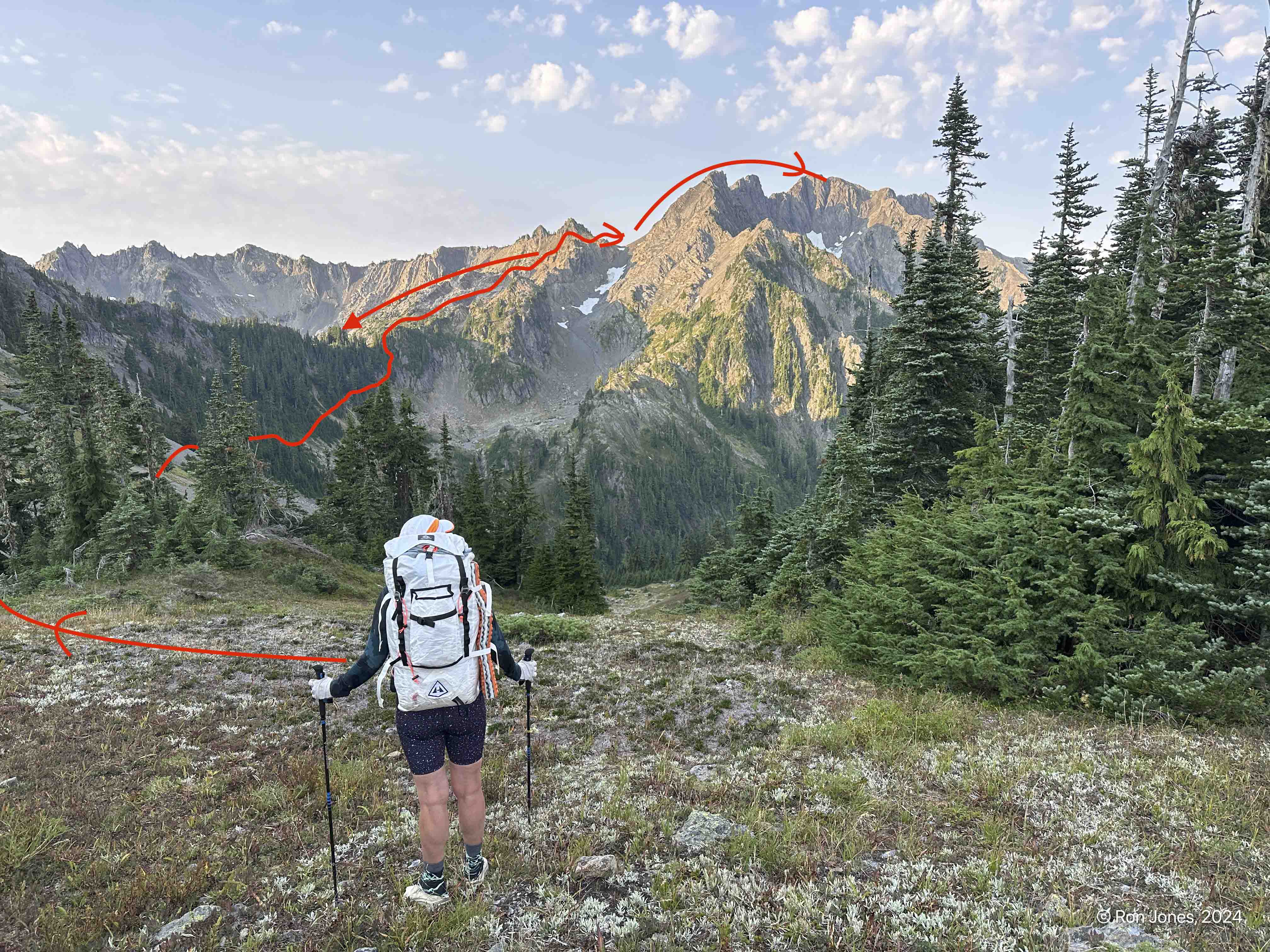 The red line shows our general path. It’s pretty straightforard to the saddle. We stayed high above Lake of Angels to the saddle. The contour around the SE face of Skokomish is a bit challenging but mostly class 2. We used a low/mid path versus going up high to a headwall.