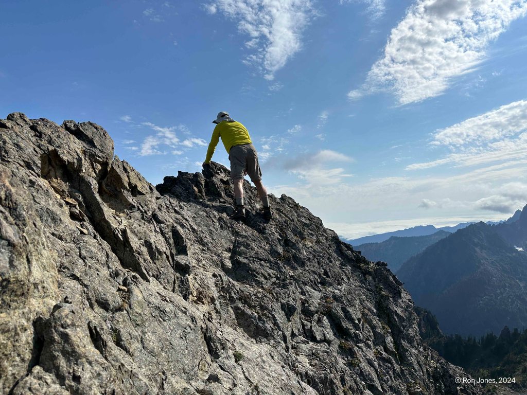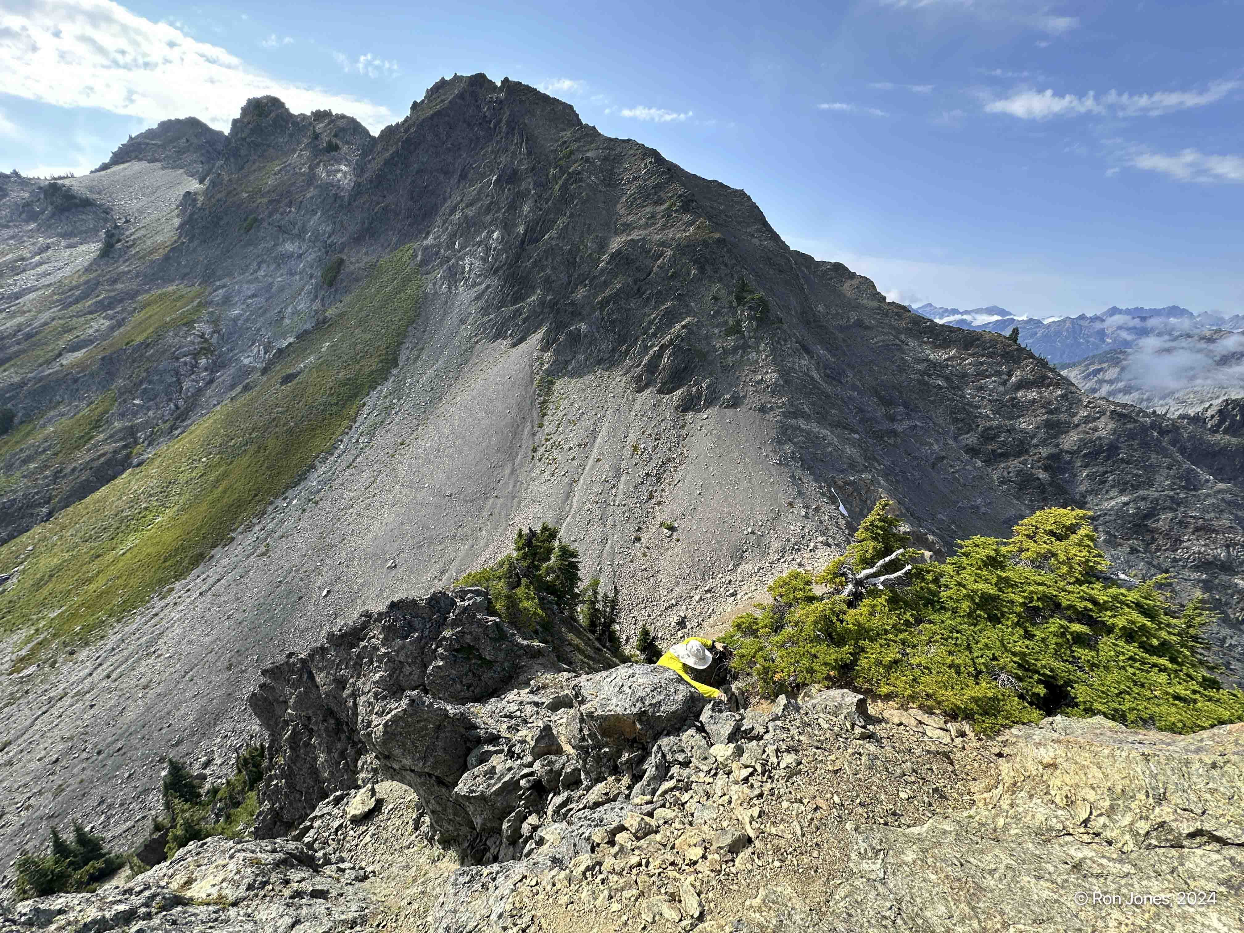 We took a break in the saddle , tagged a little bonus peak just above it, and headed down. The bonus peak has a mild pucker factor. I was near the top, and we could see a little spire beyond was about one foot higher. Drew worked his way over and tagged it, then I did it. I require an almost finger traverse, cross the ridge, bear hug around a rock and top the summit. Everything in reverse for the return.